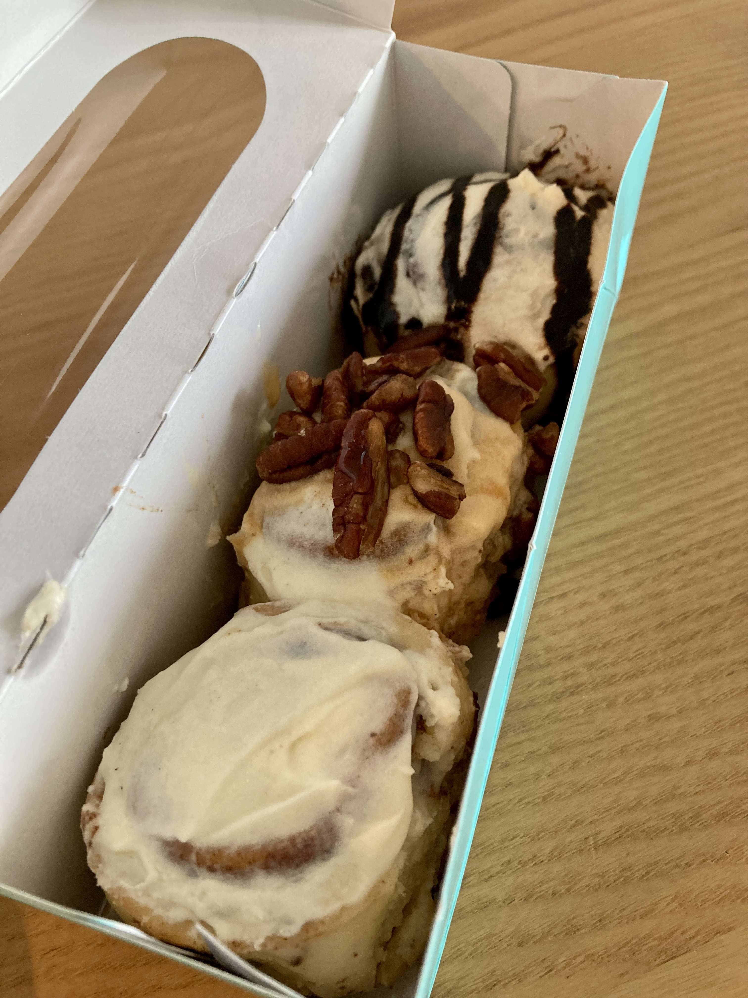 ベーシックなシナモンロール、チョコ、ピーカンナッツの3種類。