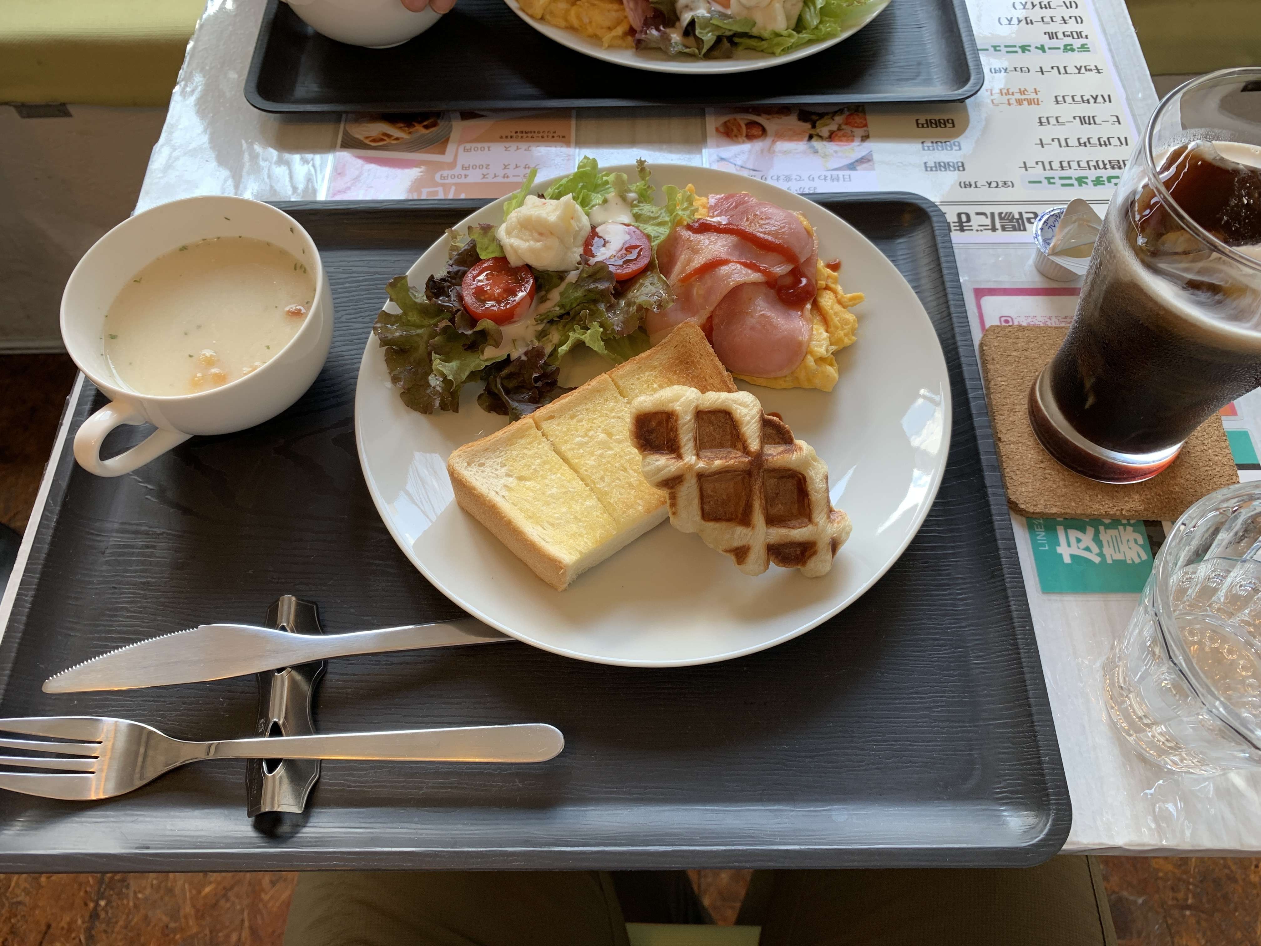 野菜のサラダとスクランブルエッグ、ベーコン、パン、ポタージュスープがセットになっていました。