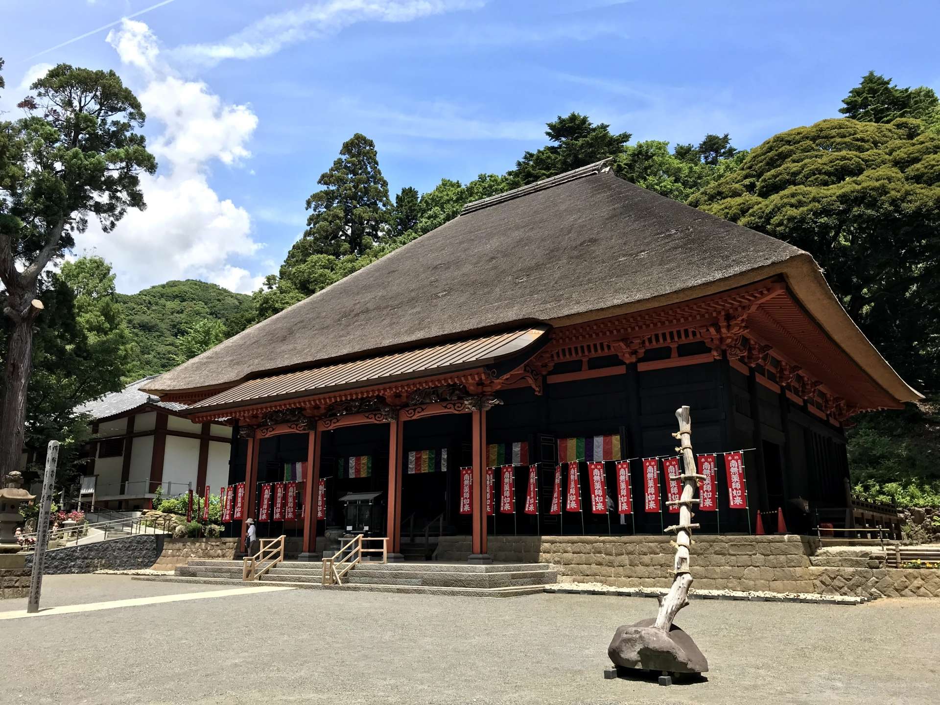 国指定重要文化財に指定されている荘厳な茅葺き屋根に黒と朱の彩色が特徴の本堂をはじめ、弘法大師の像や霊樹(シラカシの木)の中に祀られている虚空蔵菩薩様、除夜の鐘も行う国指定重要文化財の銅鐘など、貴重なものが見られますよ。
