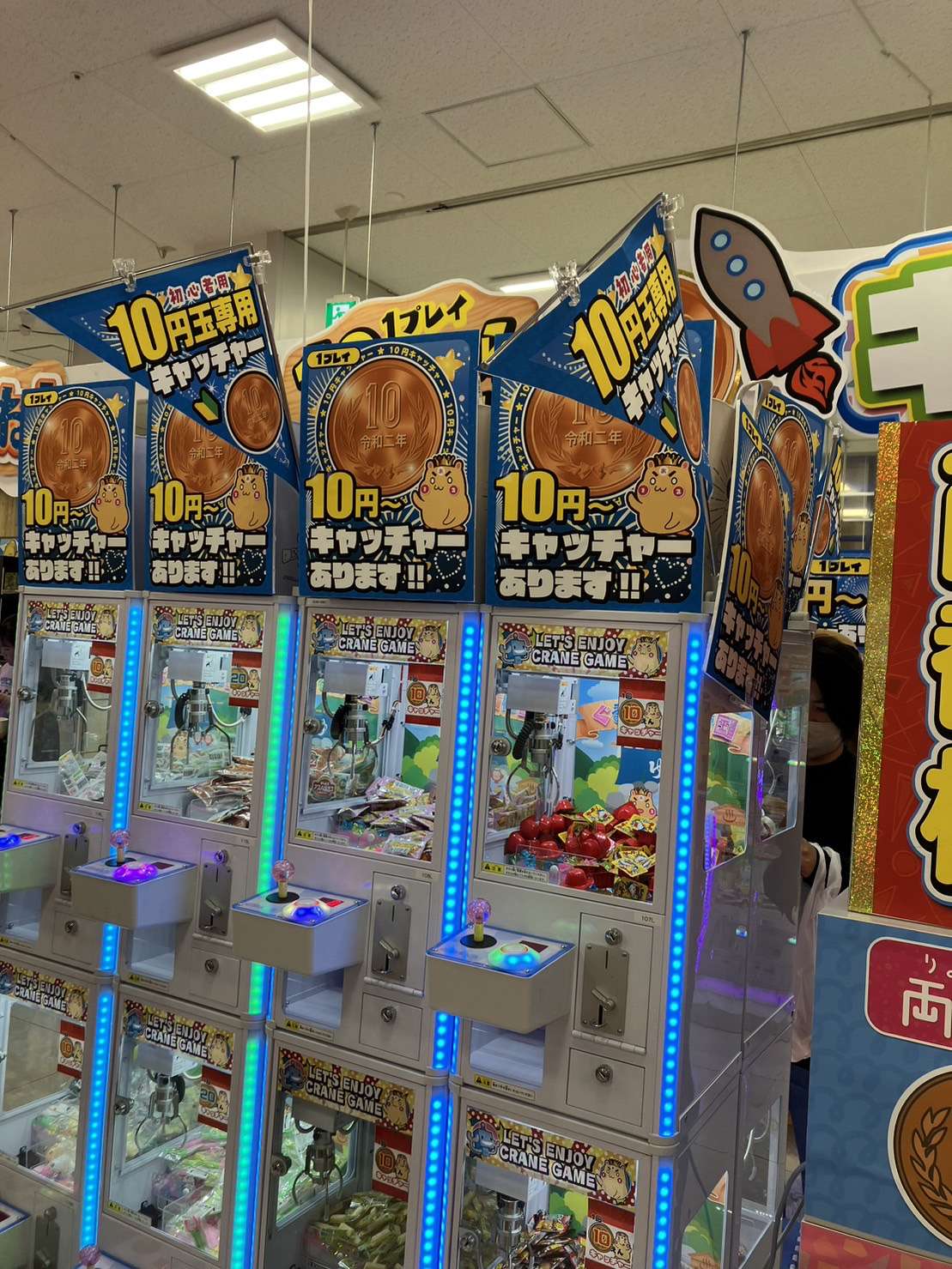 10円、20円、30円お手頃価格のクレーンゲームが並んでいます。