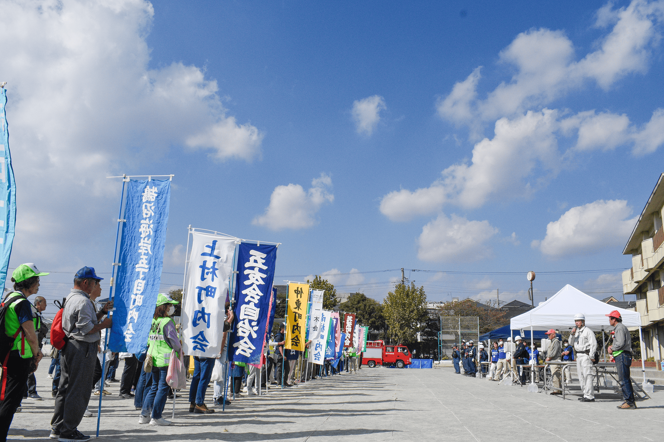 各自治町内会の旗の下に集合する姿は圧巻です。