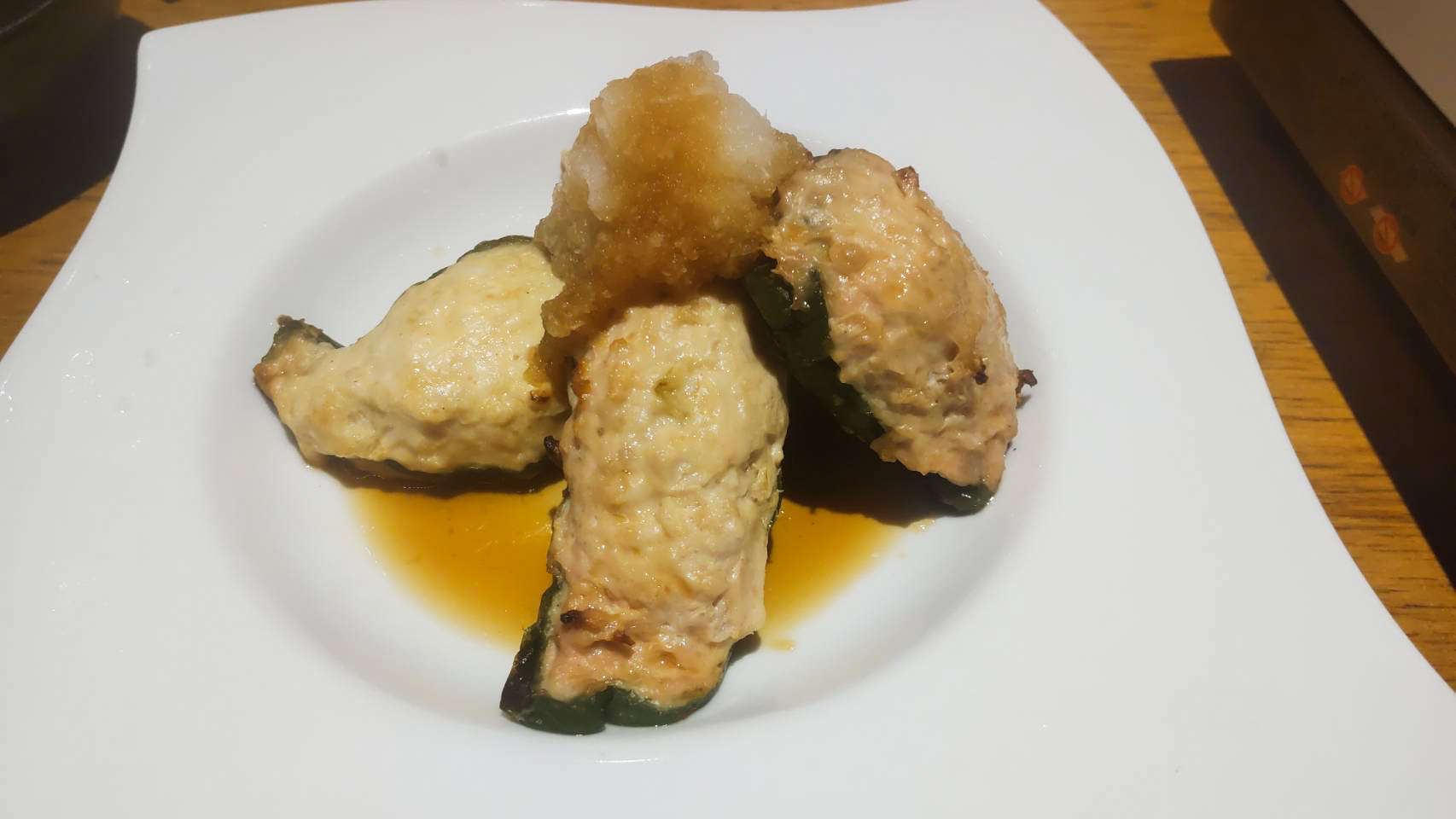 肉汁たっぷりのピーマン。大根下ろしでサッパリと頂きました。おかずとしても、おつまみとしても食べやすく店員さん自慢の一品だそう。