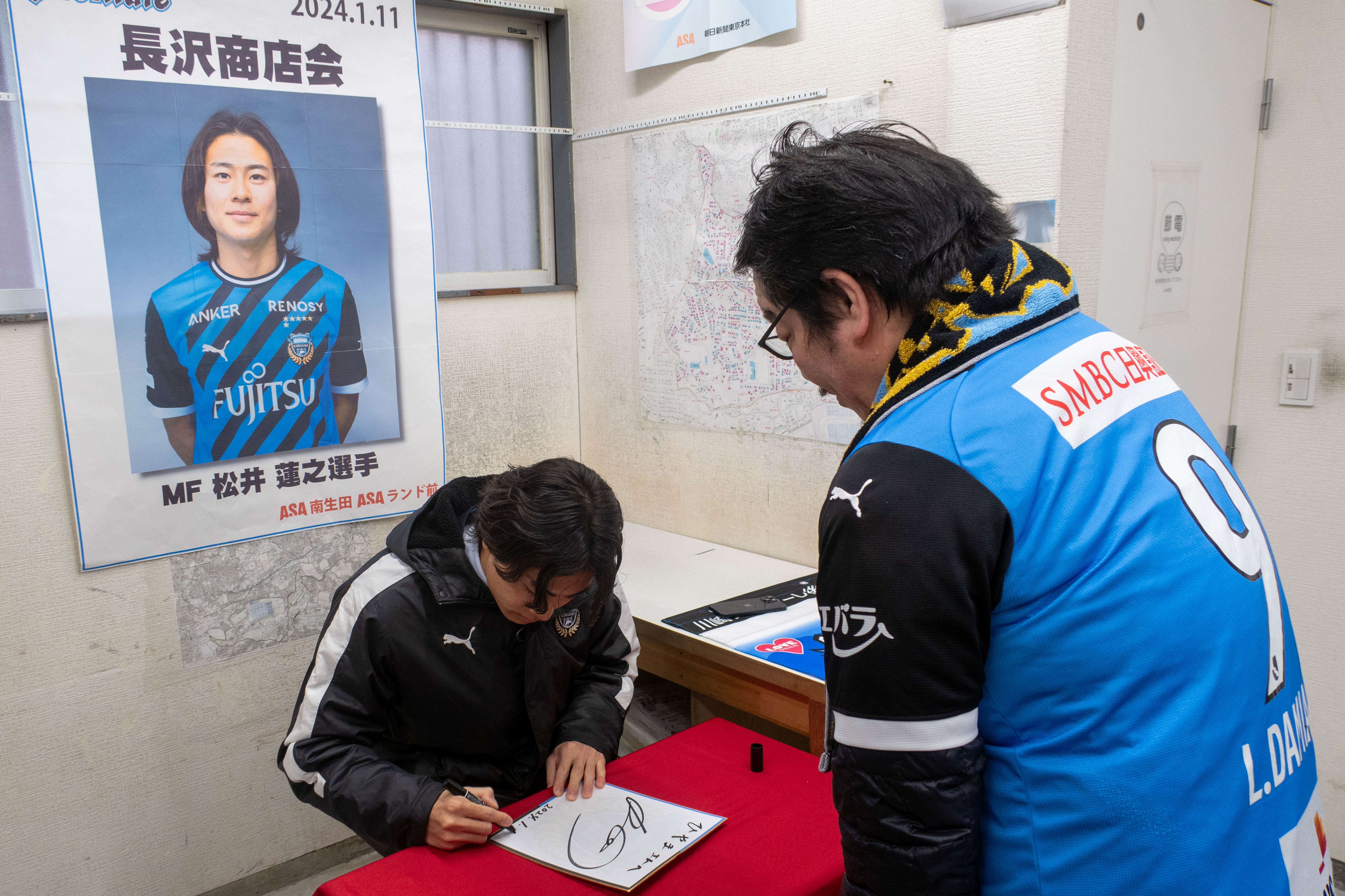 サイン会は、朝日新聞販売店(百合丘高校バス停側)で行われ、地域の人たちがユニホームやグッズを持参しサインをしてもらった。