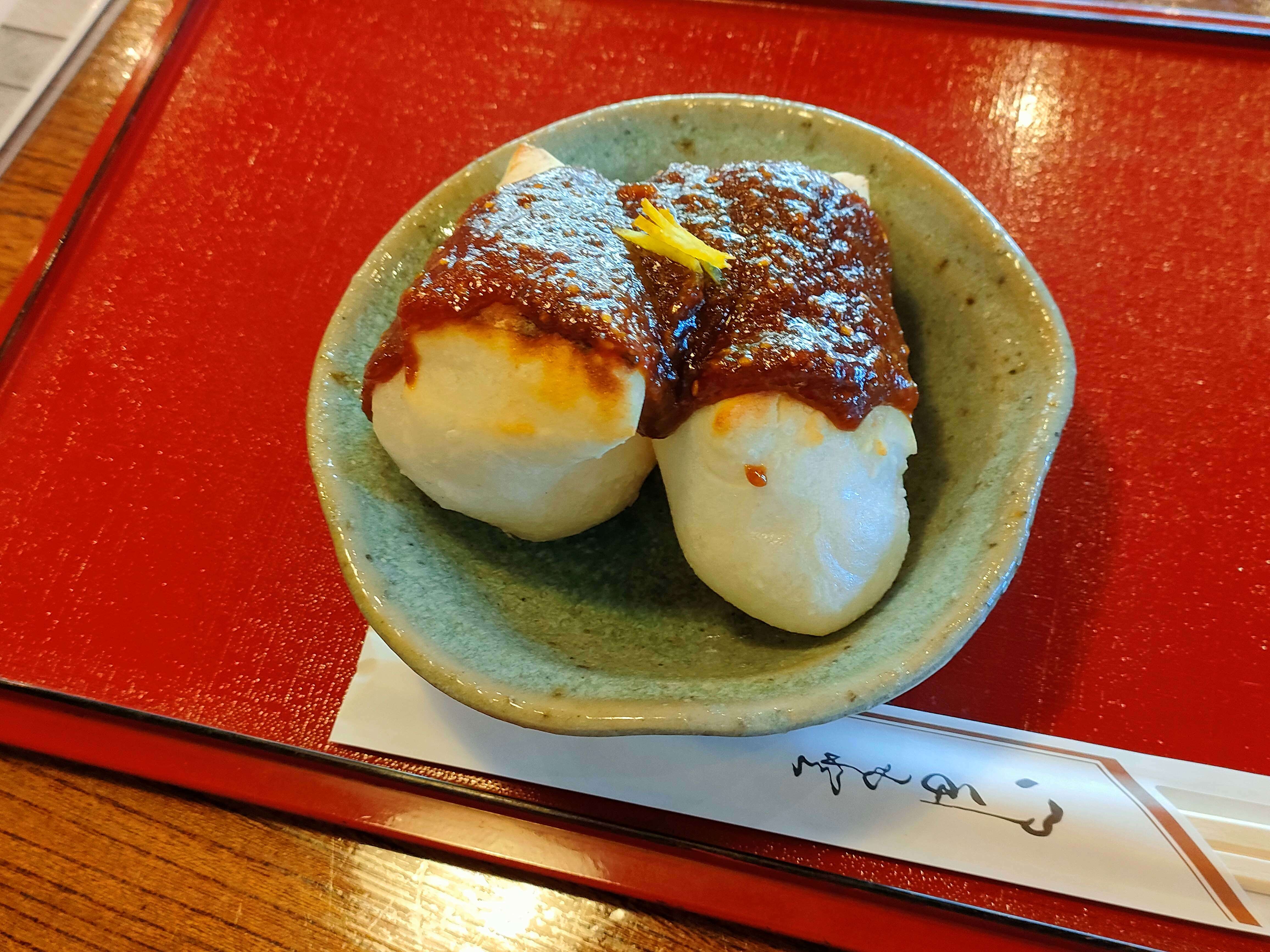 写真は甘味曽味のお餅でコクのある甘味曽に柚子が添えられています。