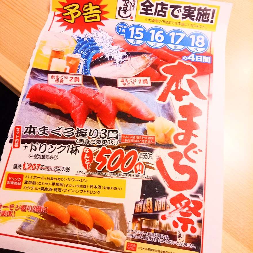 今年は、「本マグロの握り3貫」+ドリンクで500円!