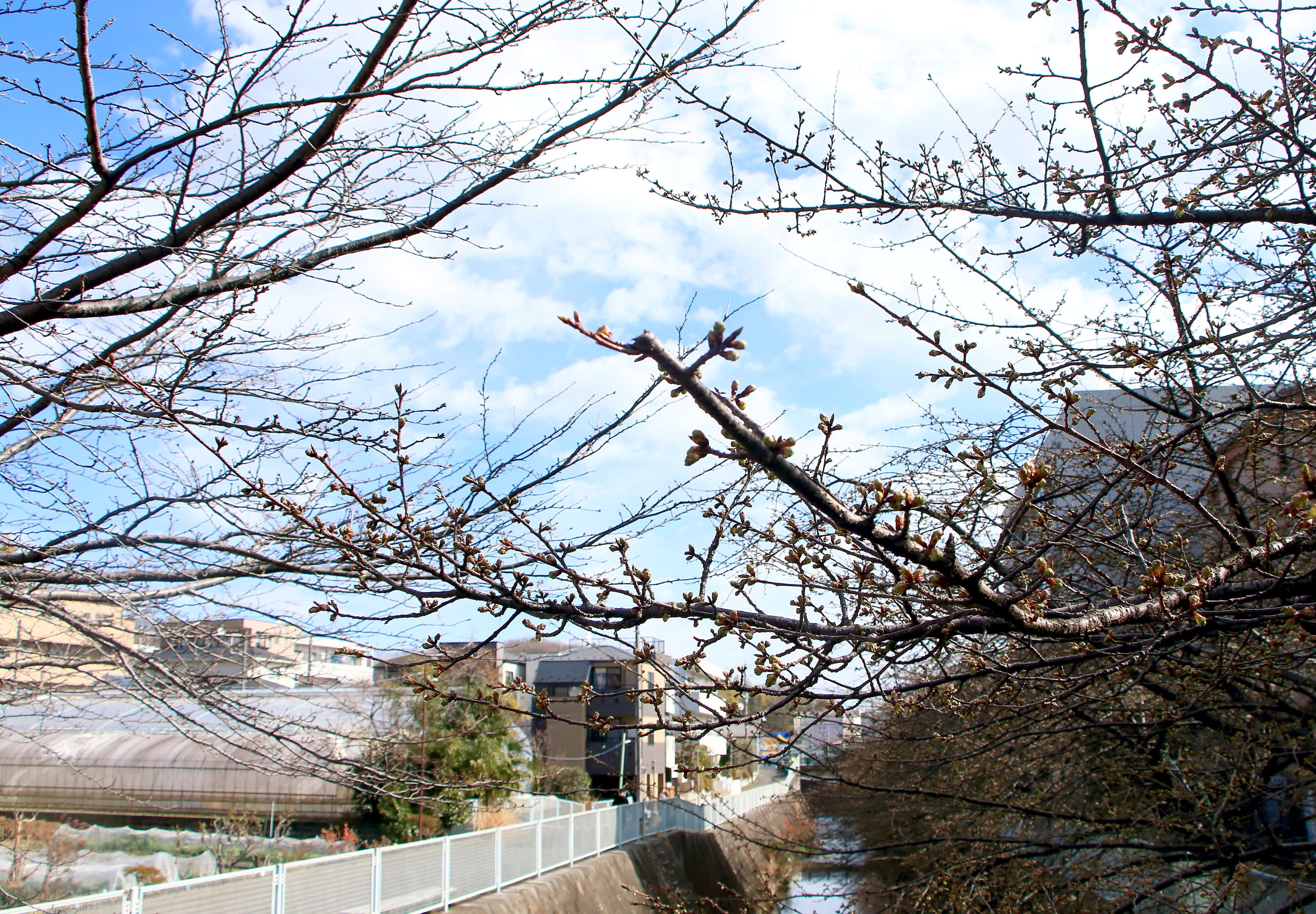 小田急線生田駅近くの五反田川沿い(川崎市多摩区生田)で、河津桜が咲き始めました。まだほんの数えるほどですが、ピンク色の可憐な花を見つけました。これからどんどん咲いてくると思います。