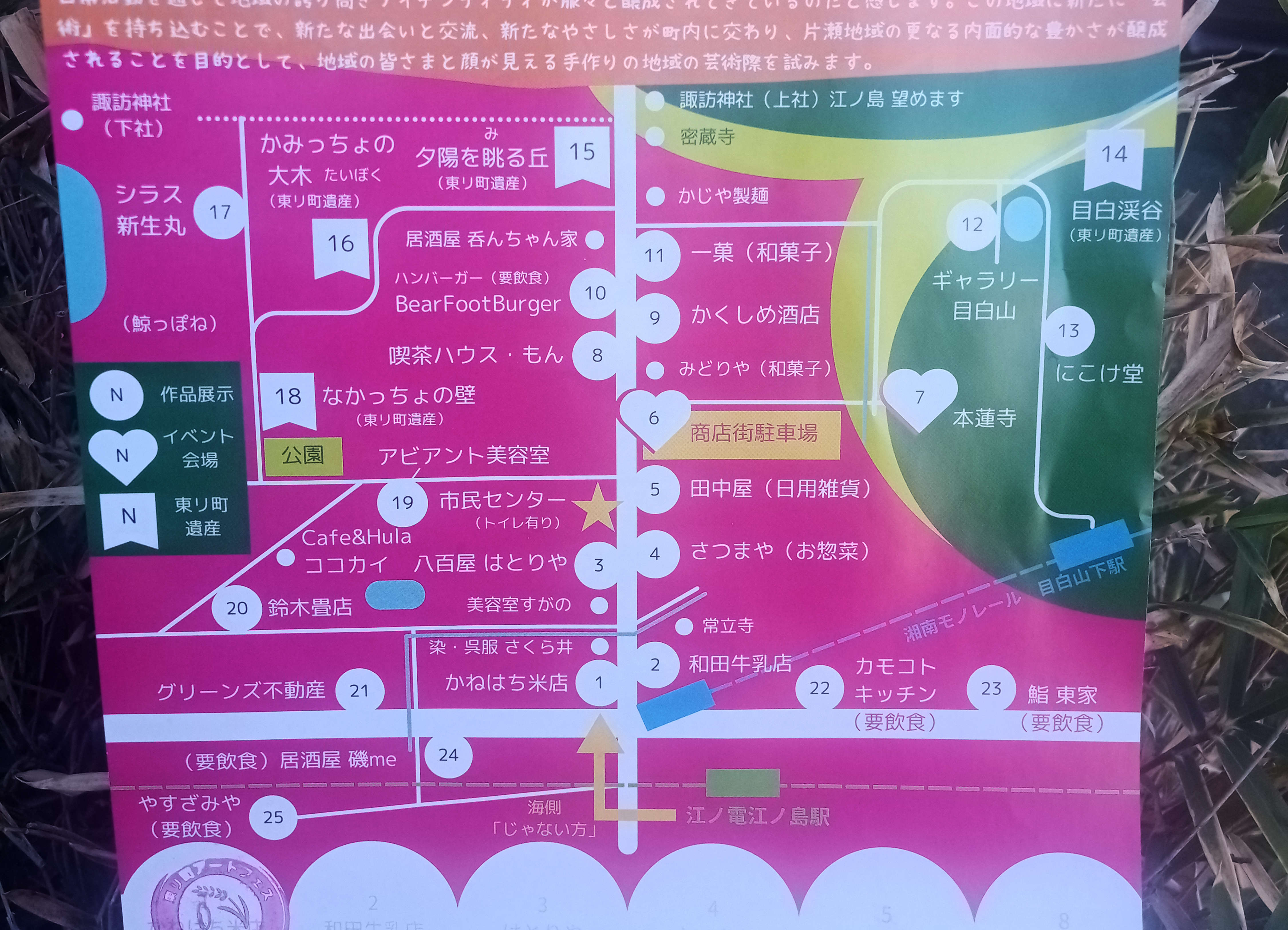 小田急片瀬江ノ島駅を降りたら、海「じゃない方」へ足を運んでみませんか?にぎやかに話題の店の並ぶすばな通りをずっと下り、江ノ電と湘南モノレールの駅を越えたら、旧藤沢宿と江ノ島を結ぶ江ノ島古道に入ります。歴史と暮らしが息づく昭和の風情ある商店街/住宅街です。そこで行われる「東リ町アートフェス」(とうりちょう あーとふぇす)を訪ねました。かねはち米店でチラシをもらって散策開始!のんびりした通りは子ども連れにも優しそう。お寺さんや児童公園、その他ちょっとしたスペースがあるので、ゆっくり立ち話もできそうです。史跡があちらこちらにあるので春休みの小旅行や夏休みの自由研究にもよさそうです。ちょっとツウな方の江ノ島に、では参りましょう。