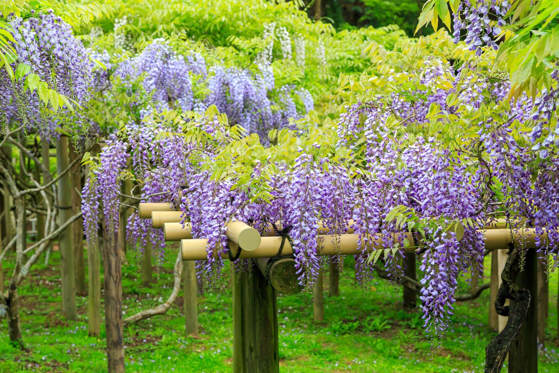 いくつかある藤棚のなかでも、はらっぱ広場にある藤棚が一番大きく、白い色の藤が彩るのが特徴です。またサービスセンター前にも藤棚がありますが、こちらは紫色の藤が咲きます。同じ園内にある藤棚でも、色が違うとまた別の景色を楽しむことができますね。