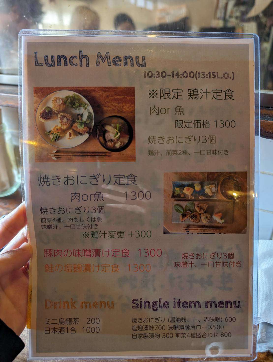 焼きおにぎり三種(白みそ、赤みそ、醤油麹)、お魚またはお肉、卵焼き、お漬物、鶏汁のセットで税込み1300円でした。