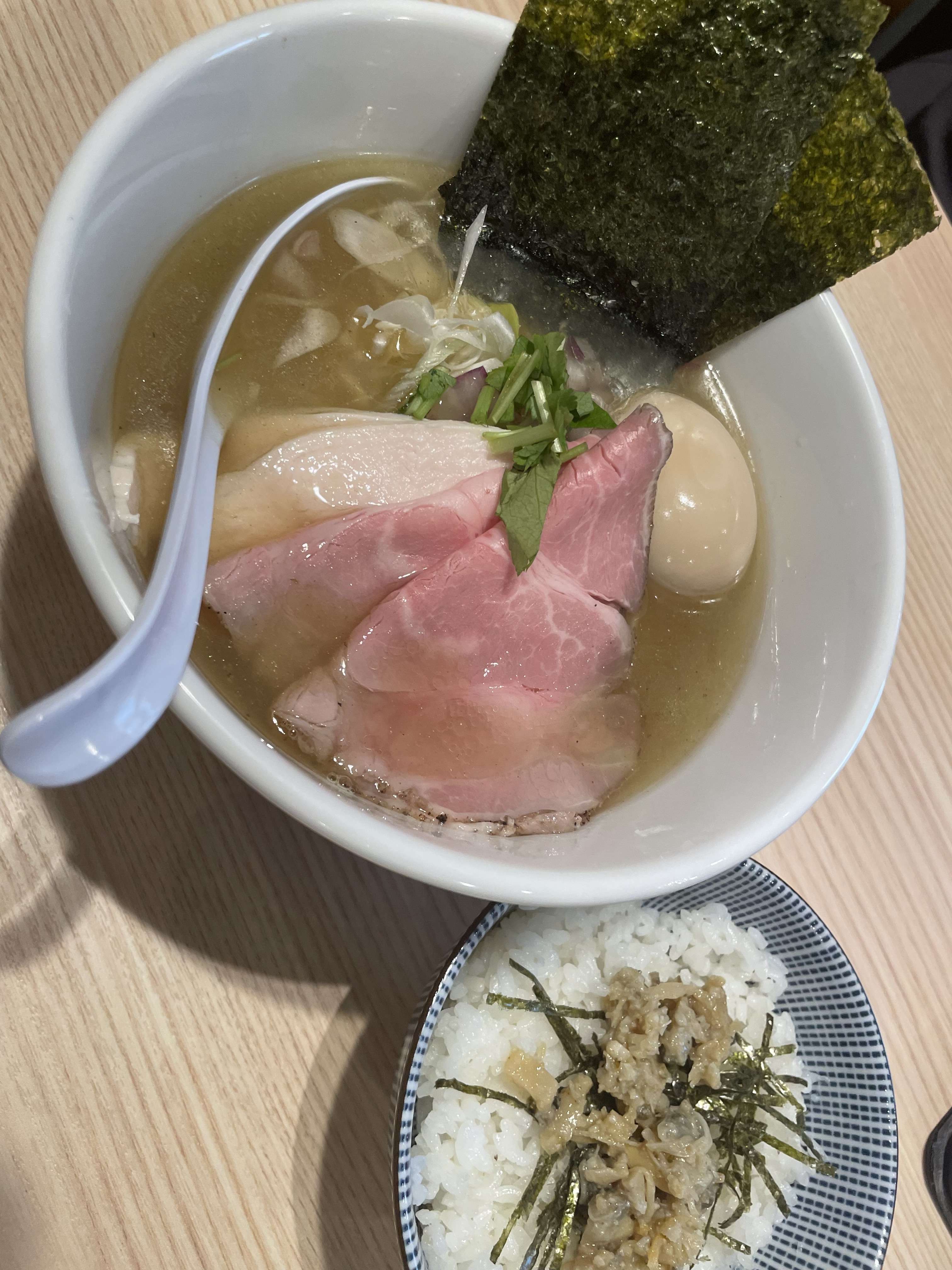 良い塩梅の塩味と合わせ出汁の和の風味がこれもまたおいしい。貝ごはんも出汁がしみてて、ラーメンとの合わせにもってこい。ぜひともおすすめです。