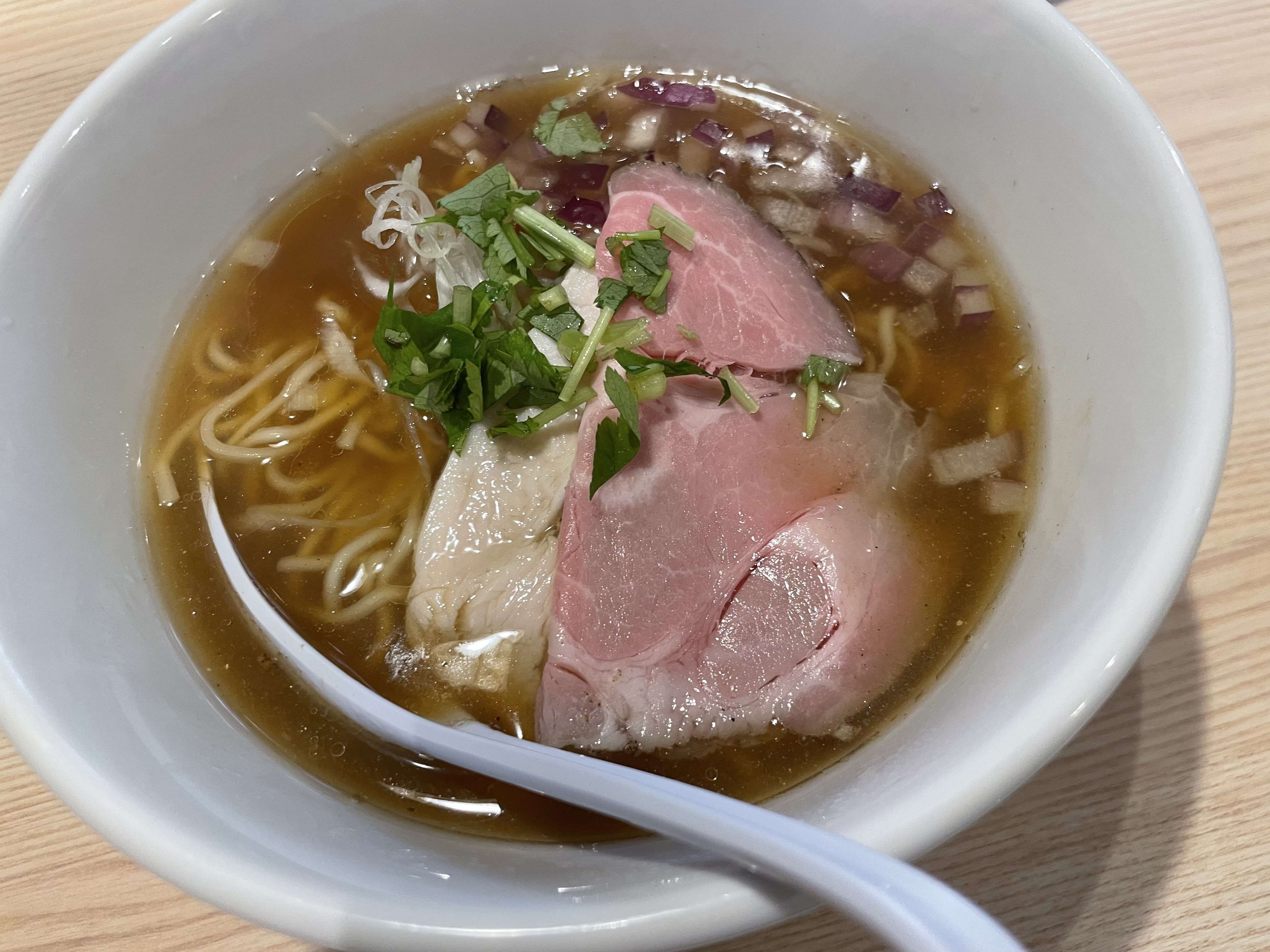 貝と焼きあごの程よい風味であっさり食べられる。二種類のチャーシューがとても美味しい!