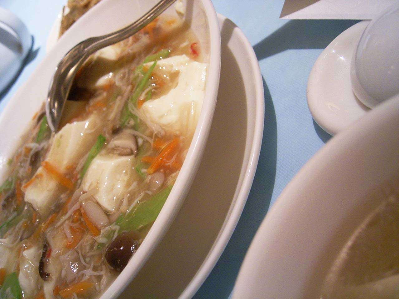 一丁の豆腐に人参、さやえんどう、蟹肉、キノコの餡掛けです。