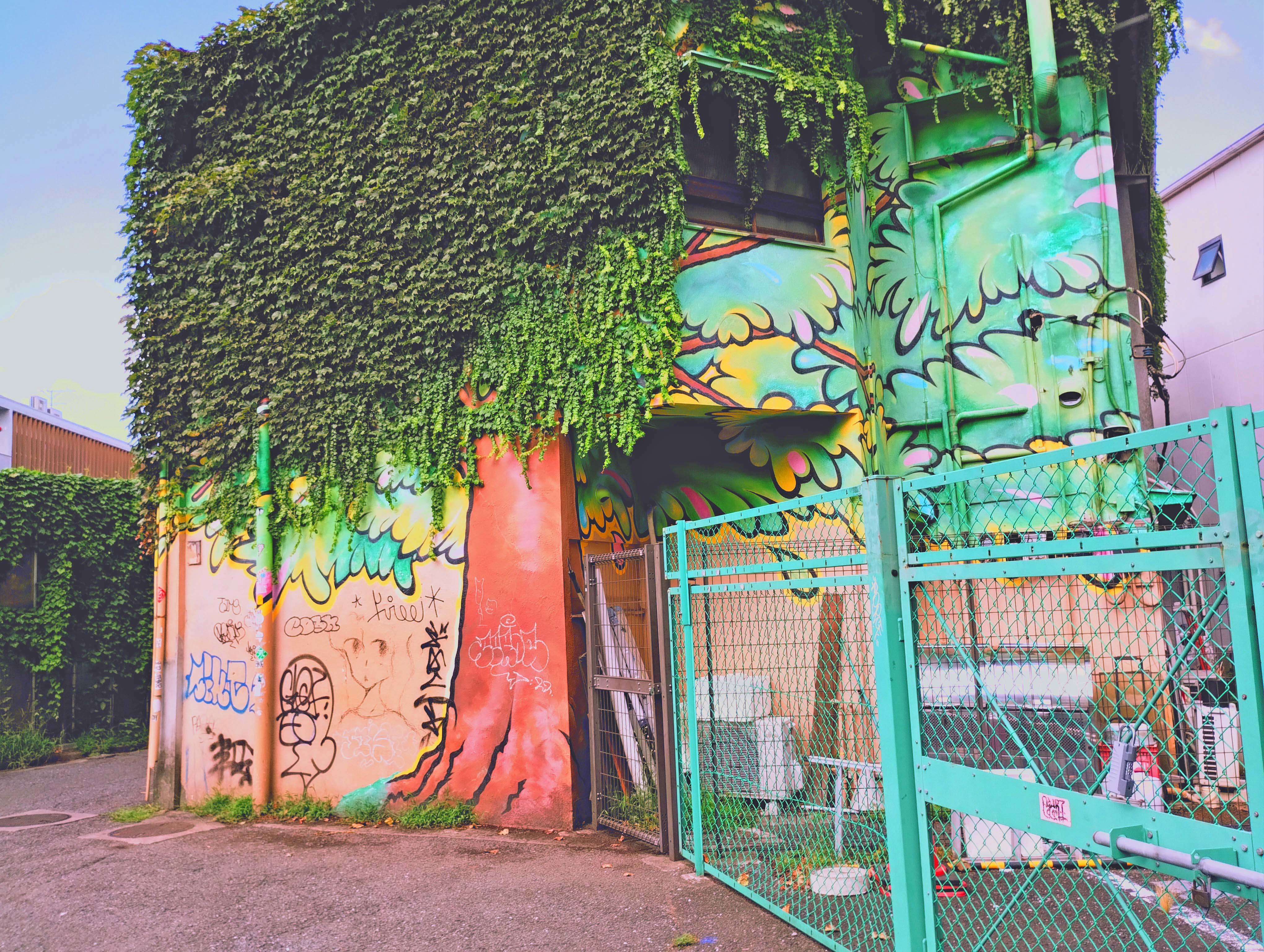 駐車場に面したツタの葉に覆われた建物にアートな壁画が描かれています。この壁の前でアニメの主人公たちが写真を撮りました。同じポーズで写真を撮っているひともいます。