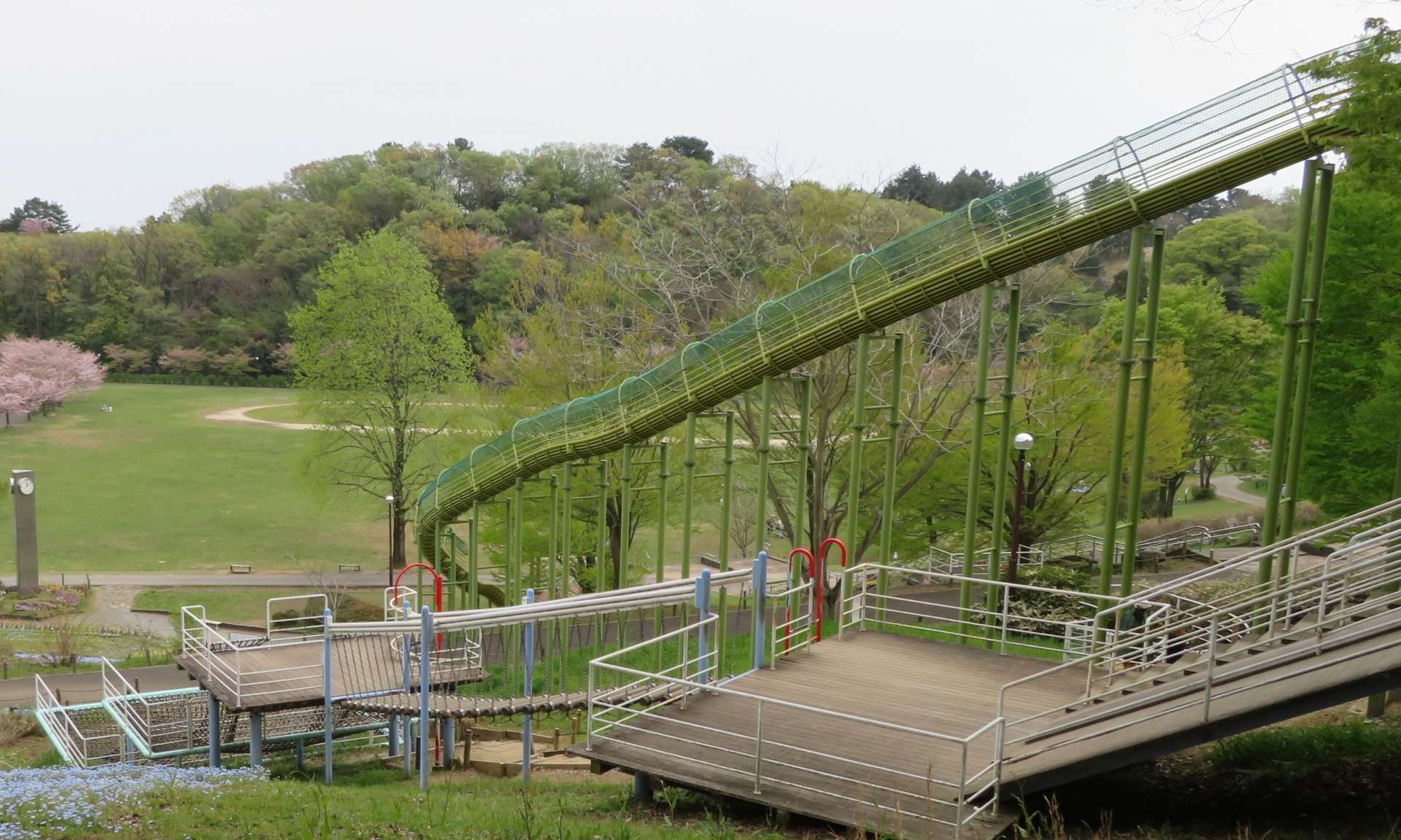 例えば、長さ65mもあるロング滑り台。見た目にも楽しそうなこの滑り台は、子どもたちに大人気のスポットです。それ以外にもアスレチックも充実しています。ロープで作られたトンネルやターザンロープがあったり、籠に乗って移動ができたりと、お子様が喜ぶ仕掛けがたくさん。一日中、夢中になって遊べますよ。
