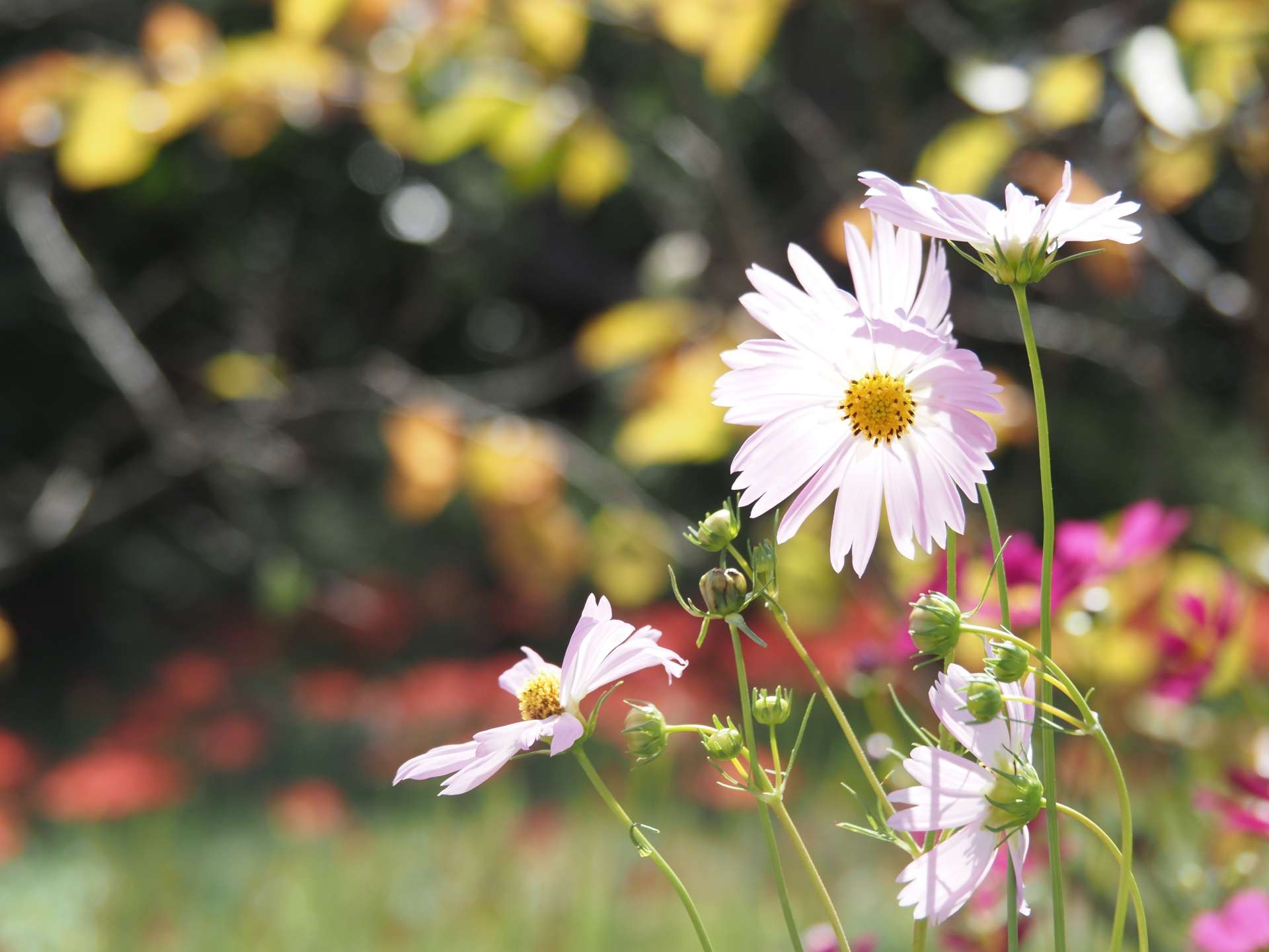 秋には、白やピンクのコスモスが一面に咲き誇ります。可愛らしいコスモスを楽しみたい方は、9月から10月にかけての開花時期を狙ってみるのがおすすめです。また、このコスモスと同じ時期に、駐車場近くではキバナコスモスが見頃になるので、そちらも見逃せません。