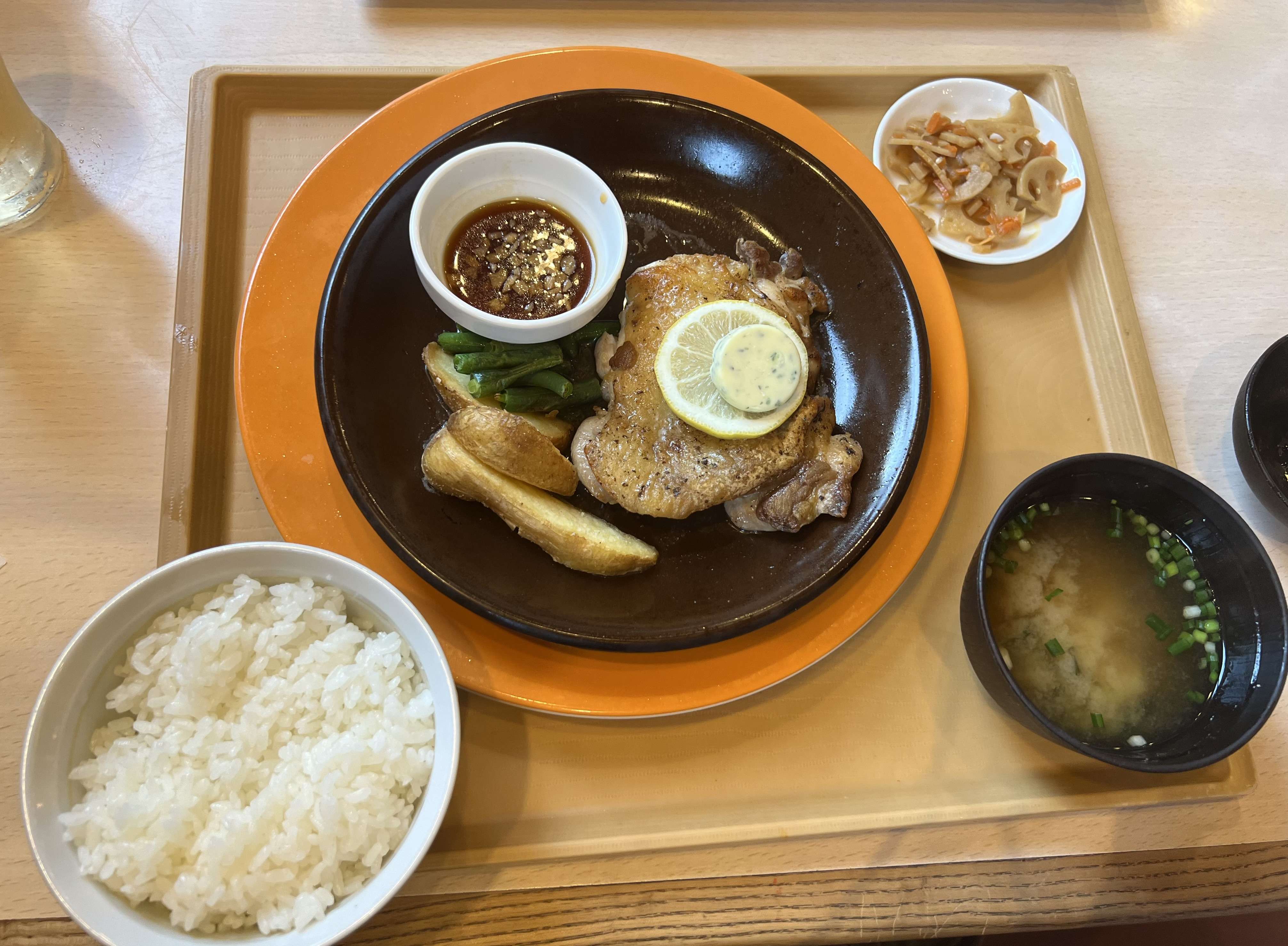 徳島県産阿波尾鶏のポークソテーに、ご飯、お味噌汁、箸休めを付けました。とてもおいしく、栄養満点のメニューです。徳島県産の「阿波尾鶏」も食べてみたい鶏肉だったので大満足です。