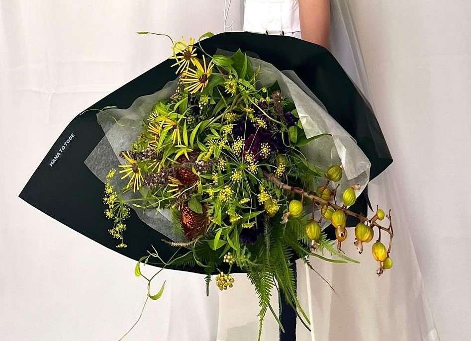 少しクセのあるお花、それぞれが一番輝くように調和と美しさを十分に引き出したアレンジには、ため息。ラッピングのカラー選びもステキ。