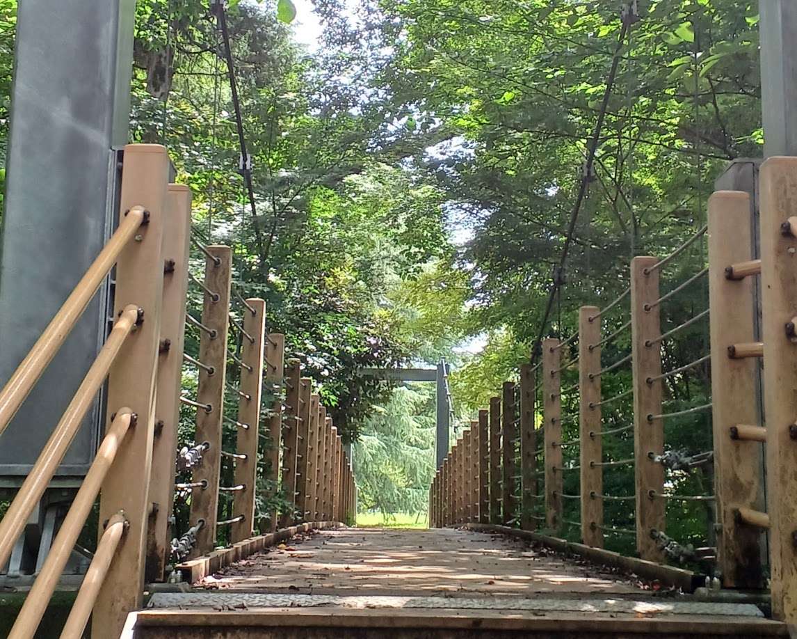 園内には珍しい吊り橋がかかる、多摩川の支流「谷戸川」が静かに流れています。