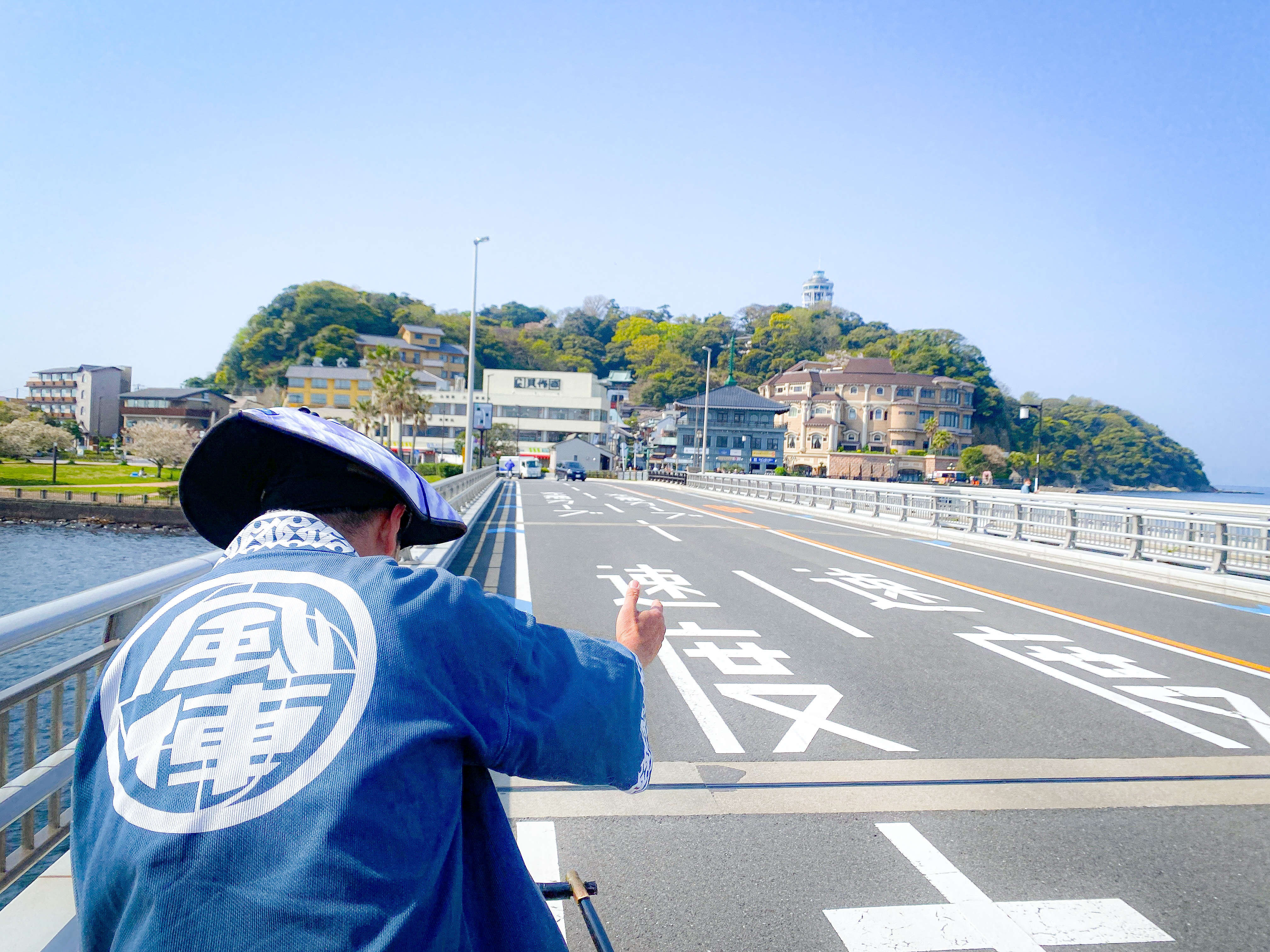 今回は、20分コースを体験。人気の新江ノ島水族館の方から、富士山を見ながら江ノ島の橋を渡り、江ノ島へ向かいました。道中、江ノ島周辺の穴場やプチ情報をたくさん教えていただきました。
