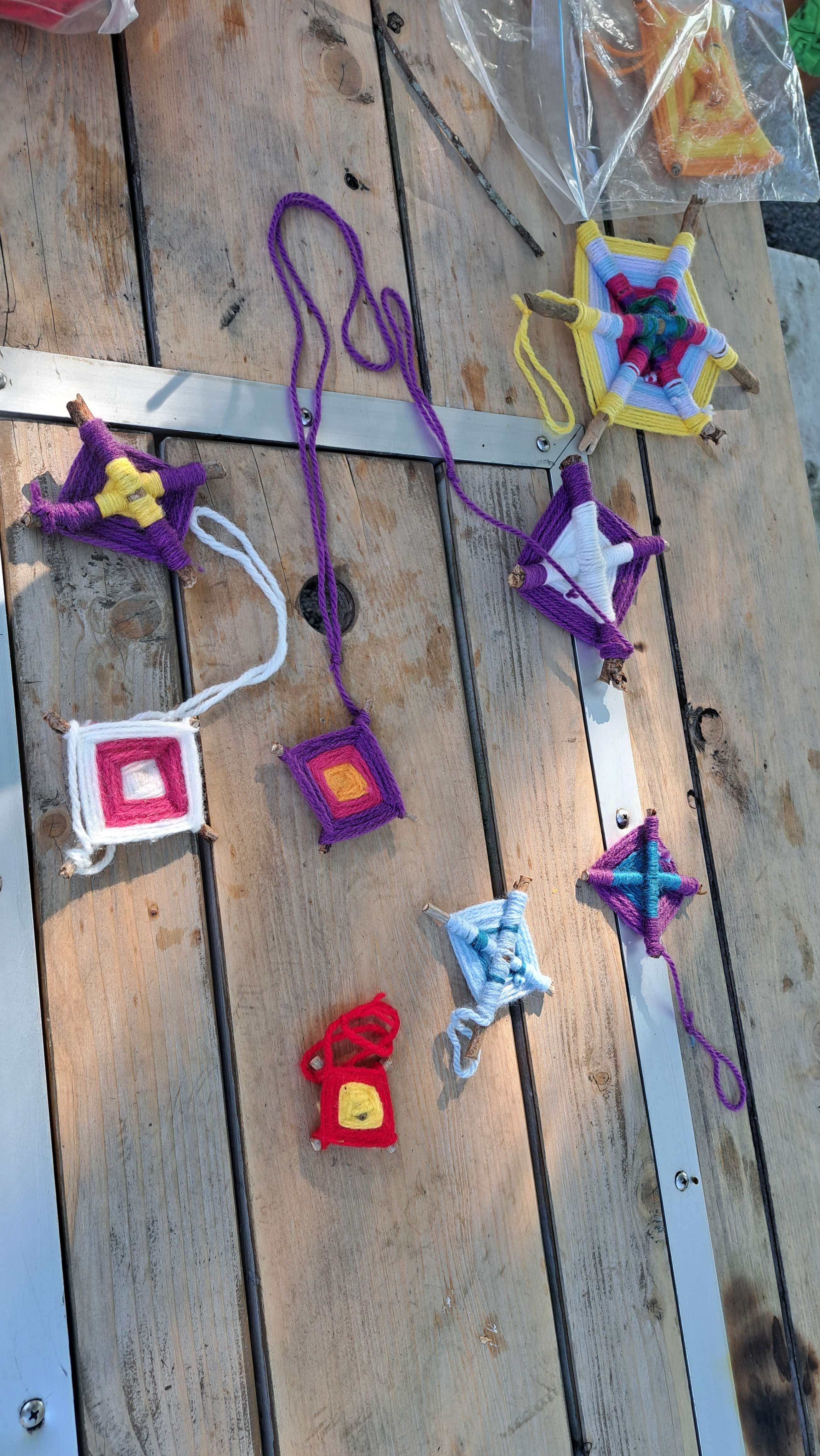 その後、東海大学ボランティア学生さんとワークショップで、ゴットアイ(写真)というインディアンの伝統的なお守りを作りました。