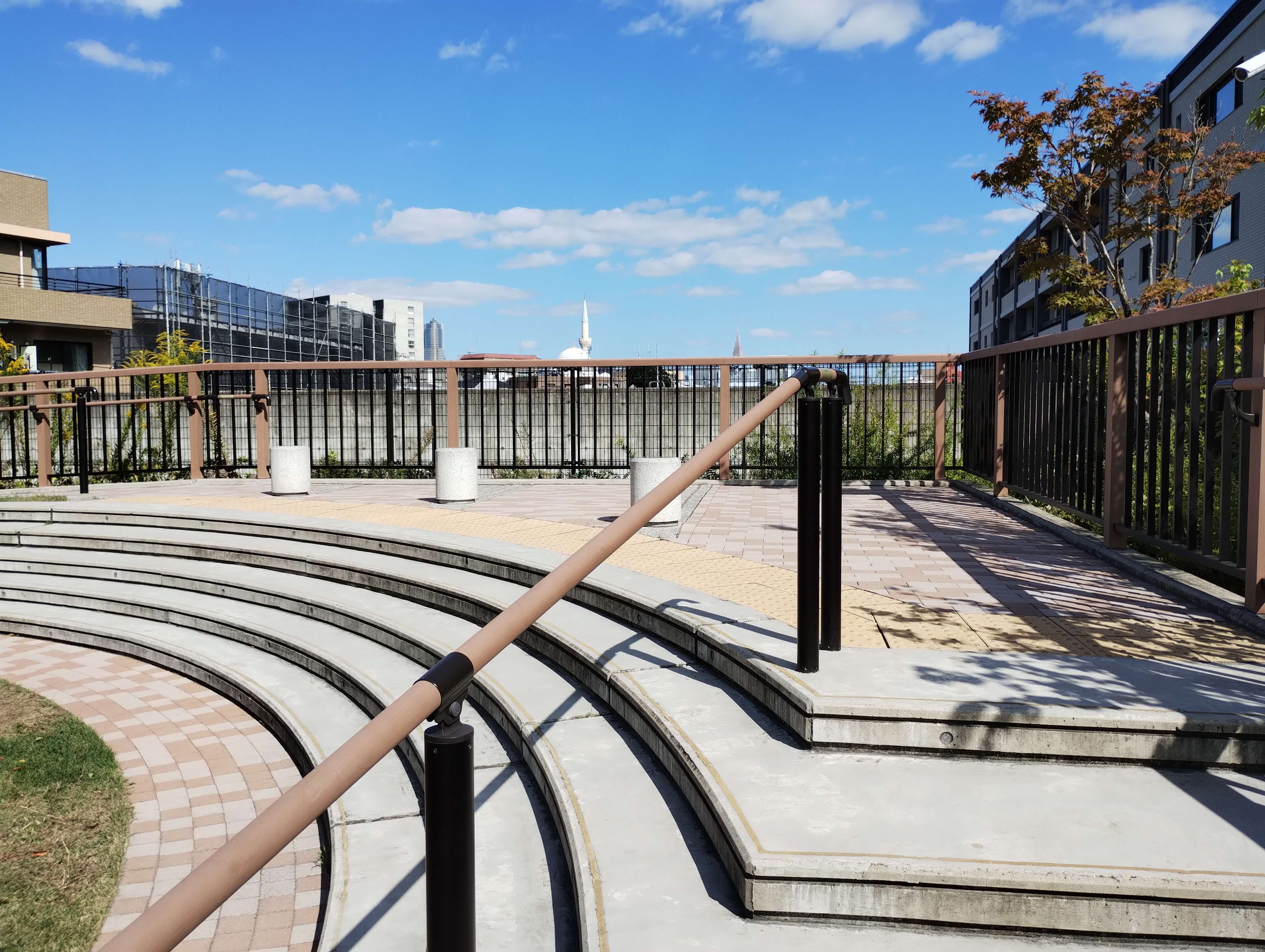 東北沢駅前ロータリーから横断歩道を渡ると、そこには小さなテラス広場が広がっています。この広場では、よく小さな子供とそのお母さんの姿を見かけます。広場の名前は「渋谷区立 大山みはらし広場」です。