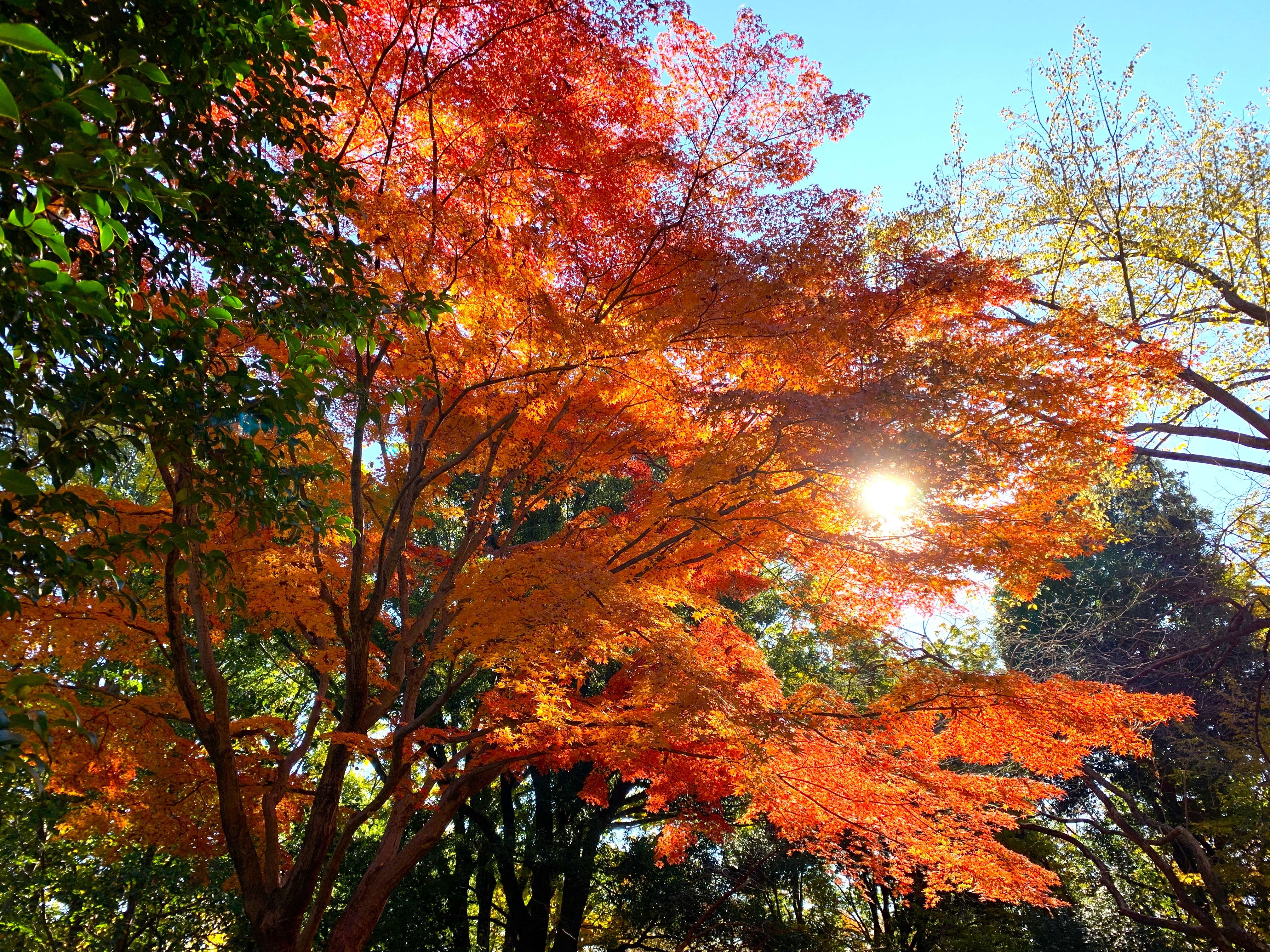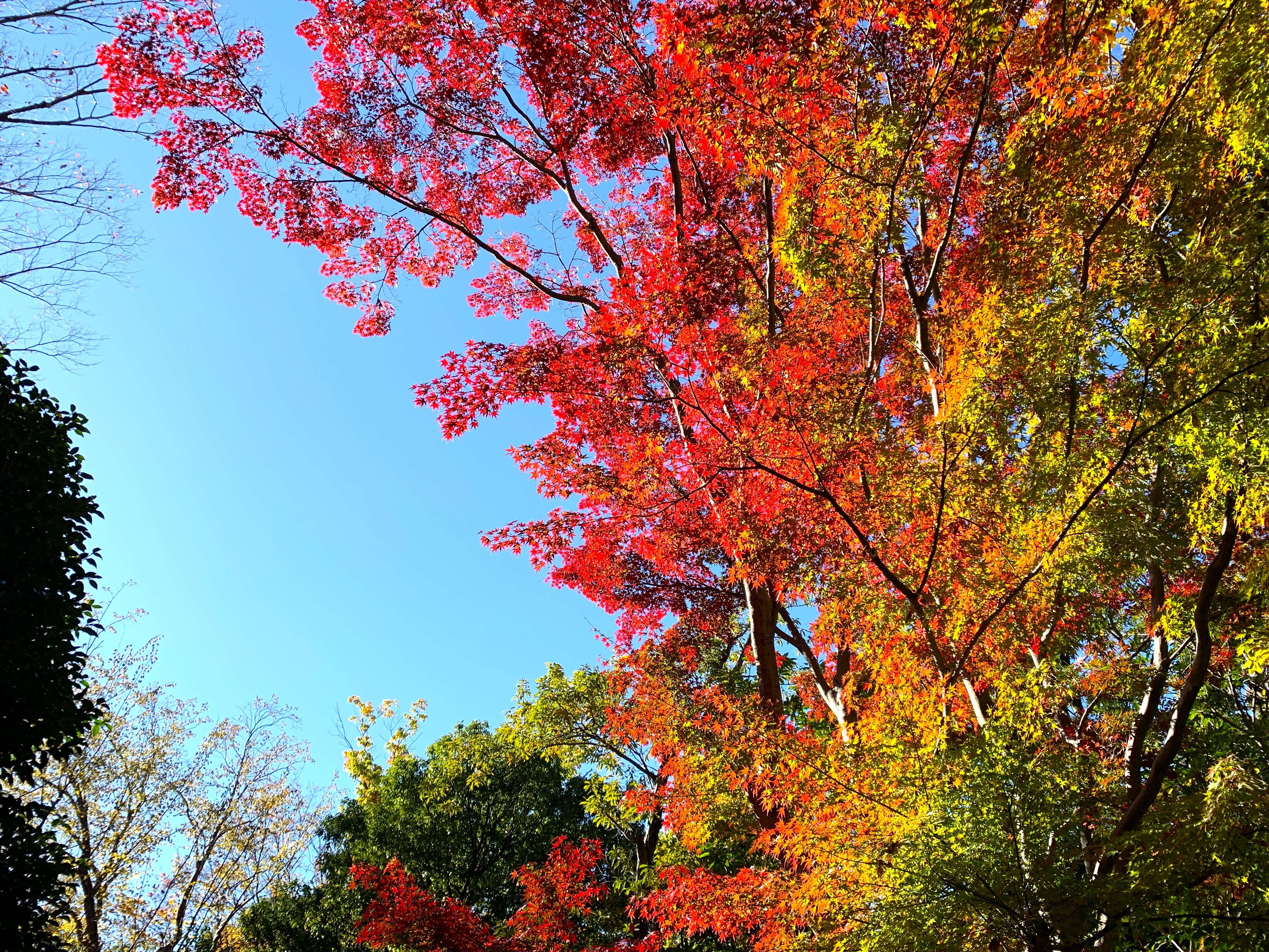今年は気温が高いせいか、まだモミジは青い葉を残していました。