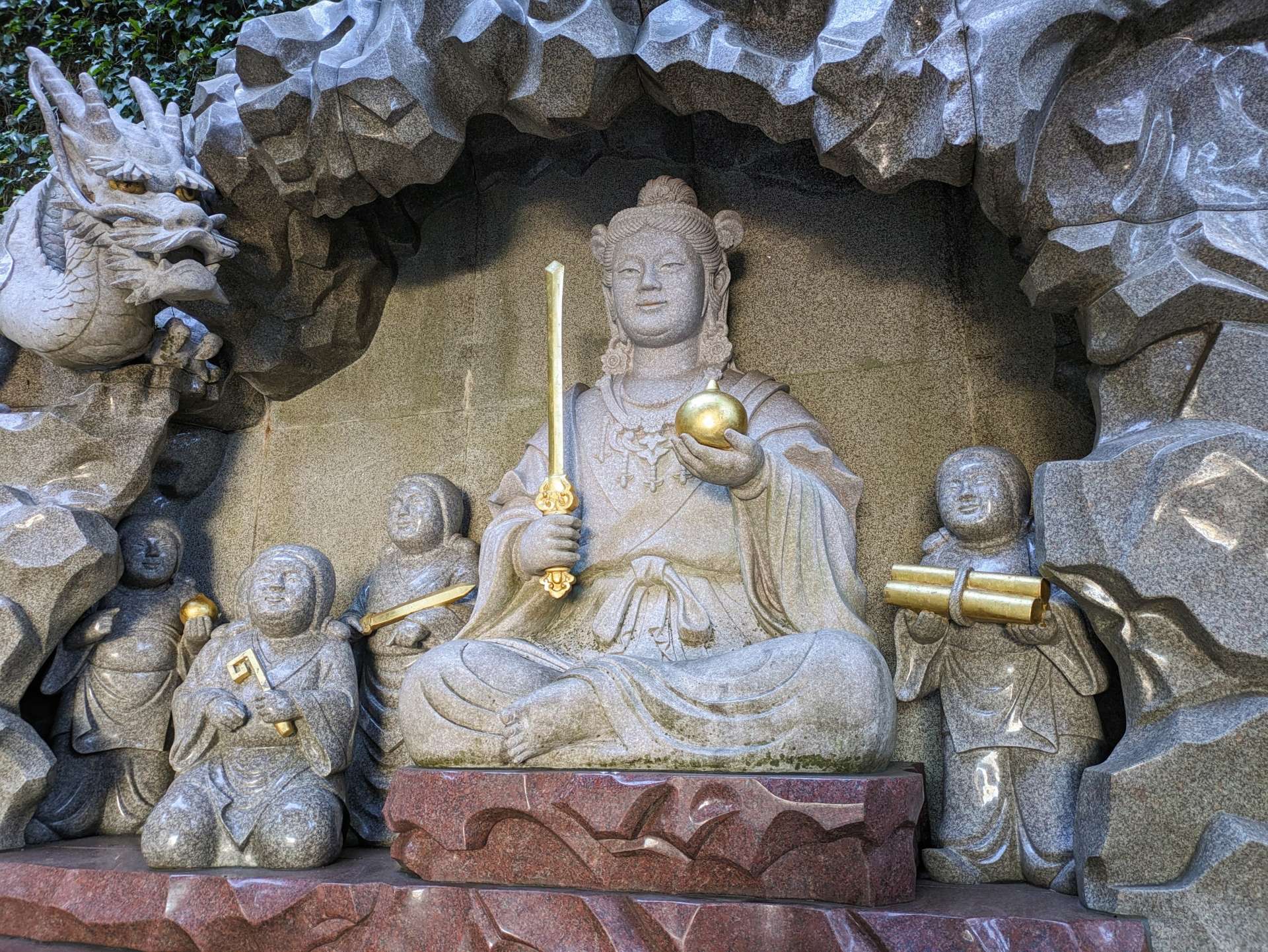 江島神社は1,000年以上の歴史を持ち、「安芸の宮島」「近江の竹生島」と並んで、日本三大弁財天のひとつとして知られています。境内の八角のお堂・奉安殿には「はっぴ弁財天」と日本三大弁財天のひとつ「妙音弁財天」が安置されています。