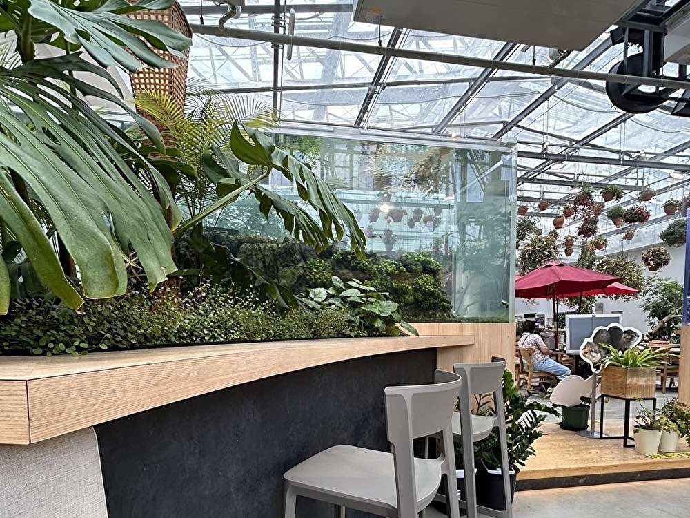 店内は本物の植栽に囲まれています。太陽の光を感じることができ素敵な空間。