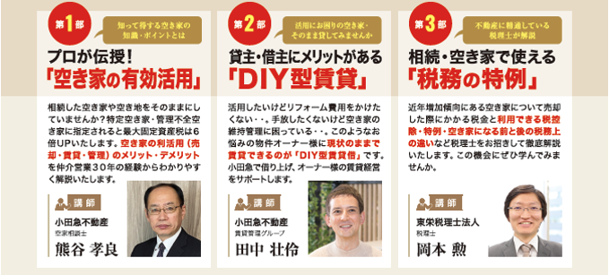 そういったお悩みをまずは3部制のセミナーを通して「空き家」に関する利活用方法や税務上の情報を学び、