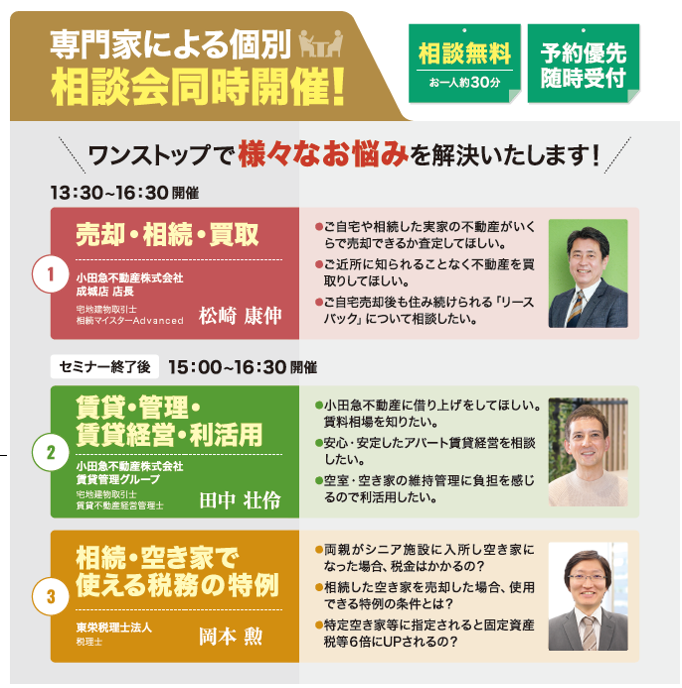その後の専門家による個別相談にて、ワンストップでお客様一人一人に合わせたお悩みをお伺いすることができました。引き続き、お悩み解決に向けて小田急不動産がサポートいたします!