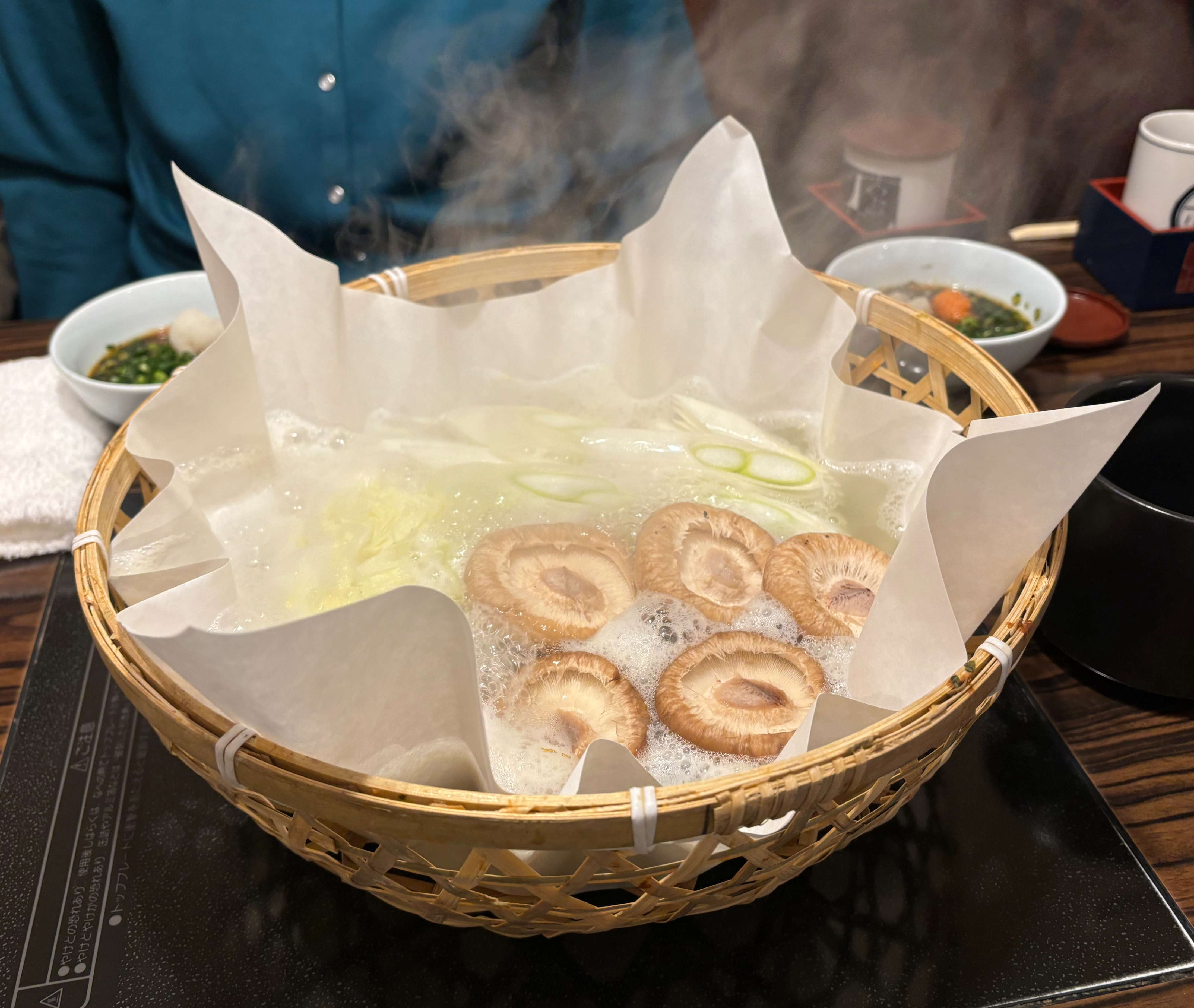 華やかな食卓にお店仕様の紙鍋で雰囲気抜群。電磁調理器で使用できる紙鍋と竹籠がオシャレ。しいたけは軸を上に入れるといいそうです。