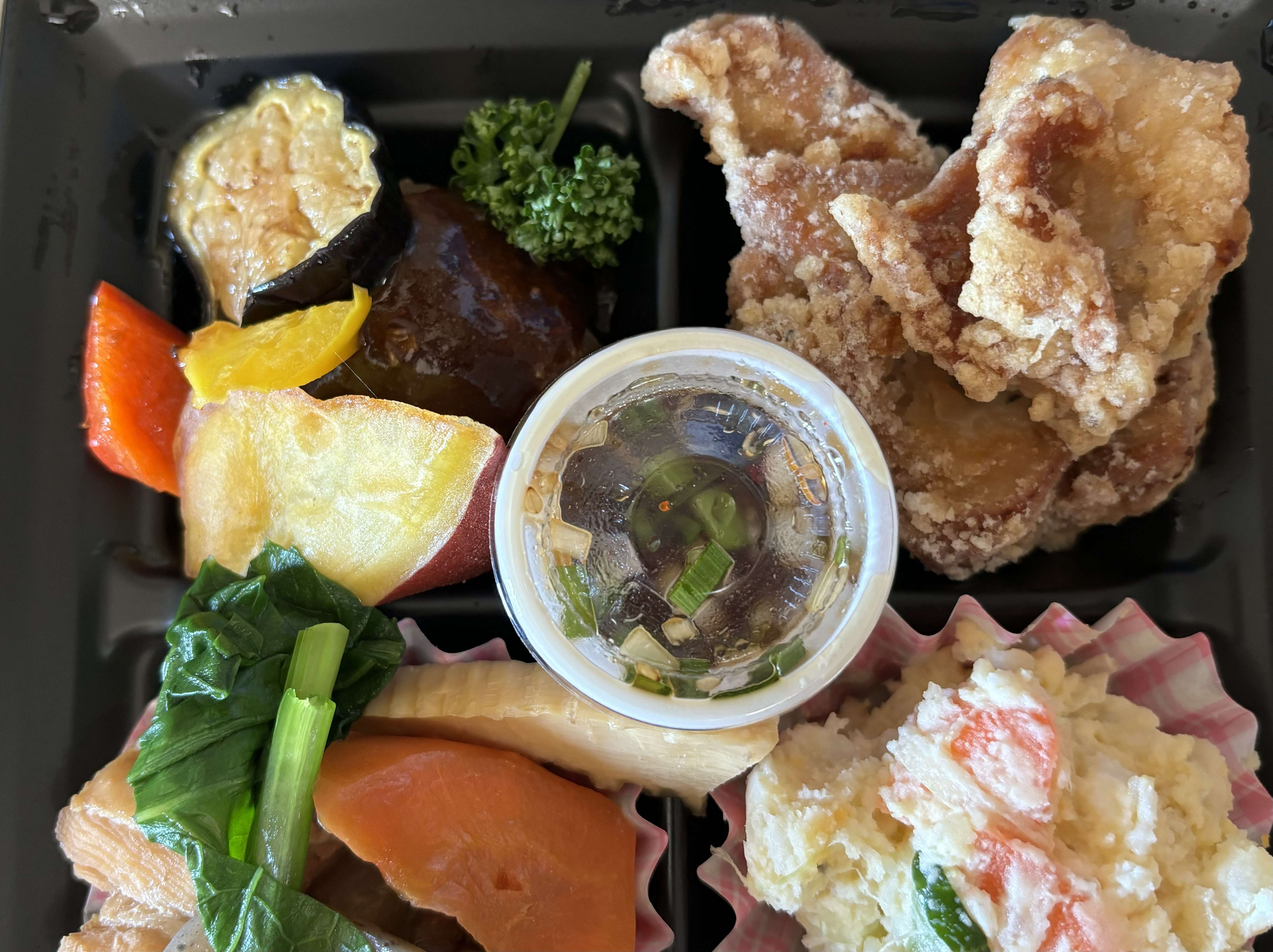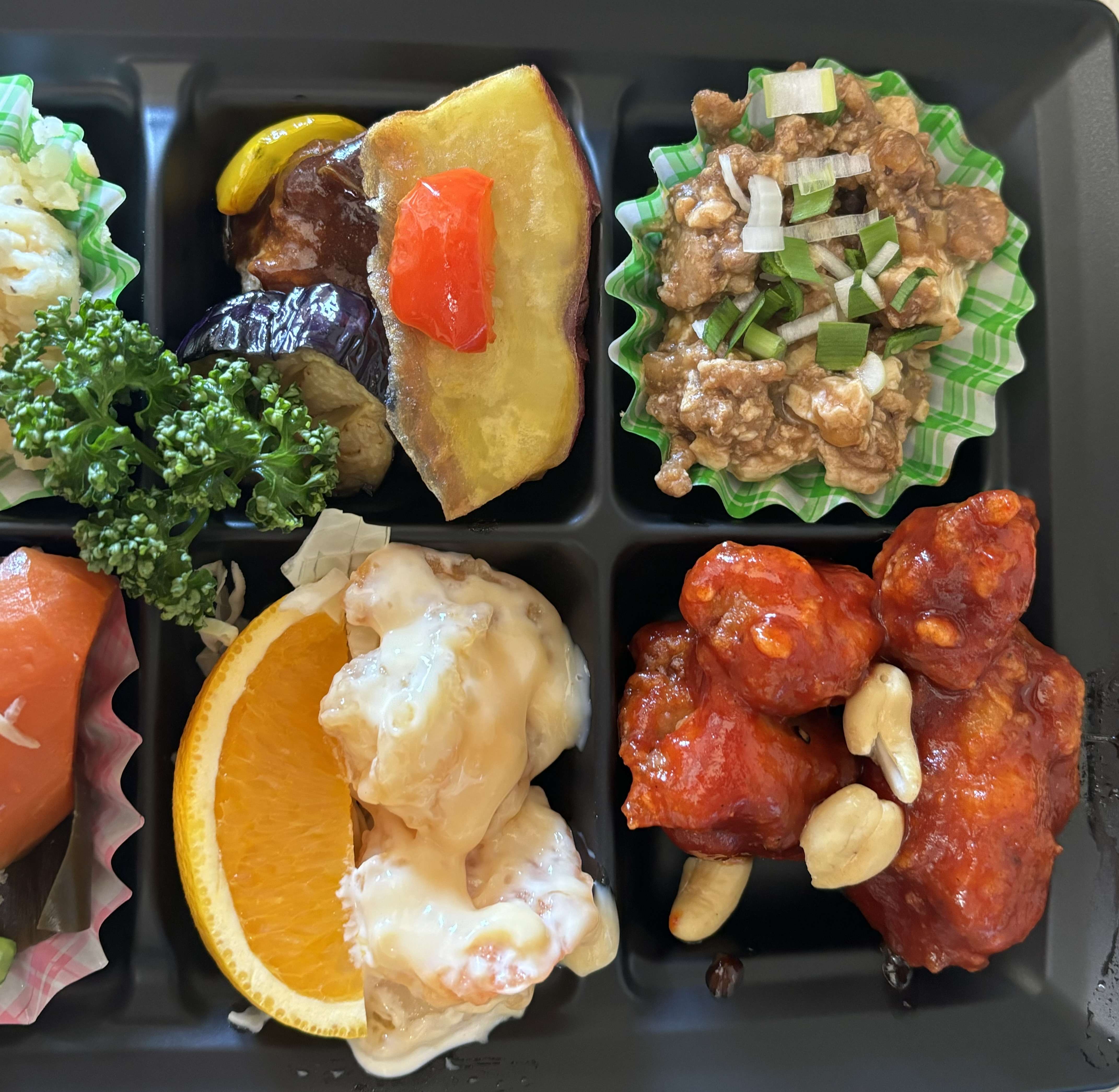 エビマヨ、ハンバーグ、ヤムニョムチキン、ポテトサラダ、煮物などたくさん入っていました。
