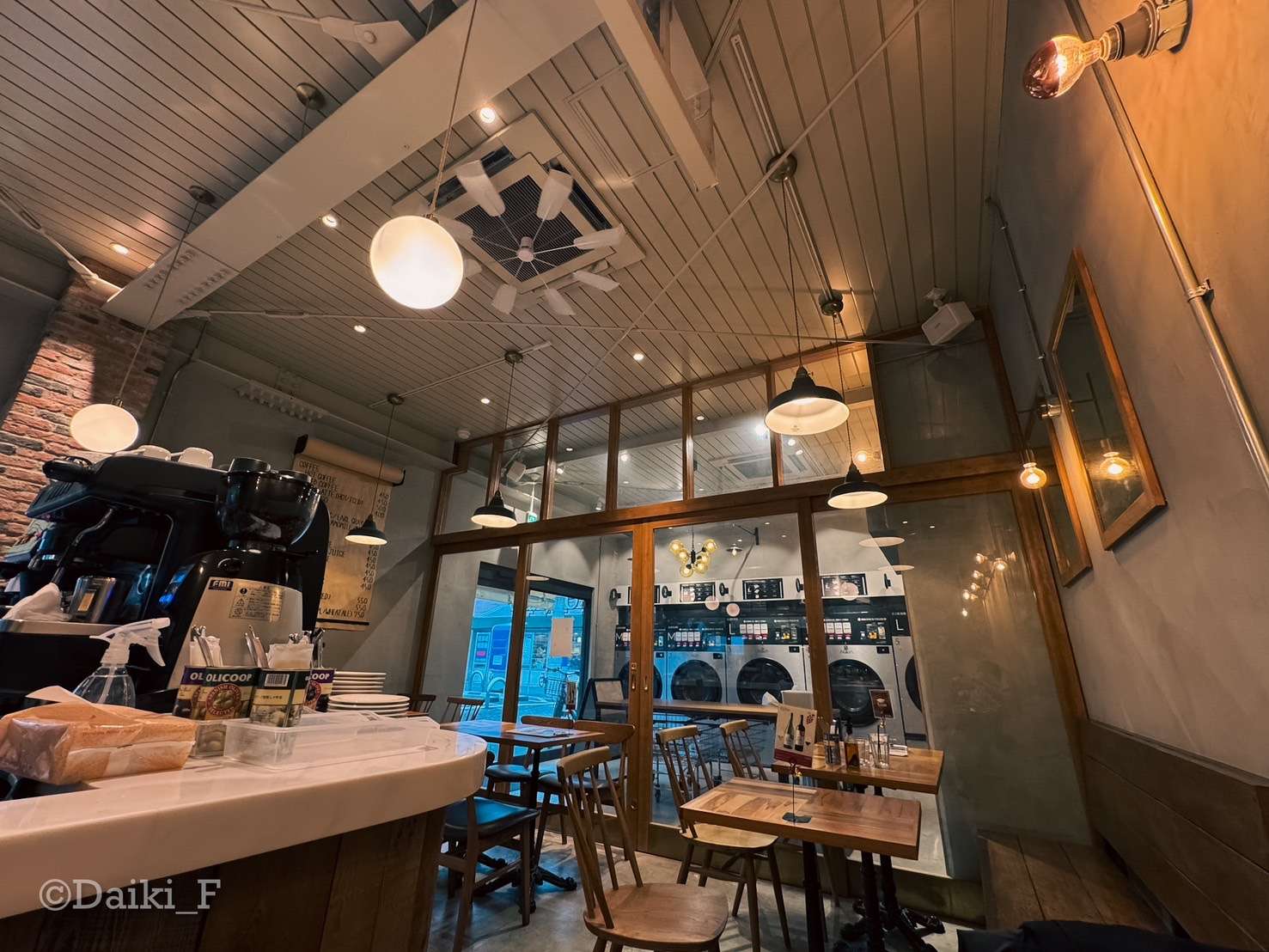 ところで、食べながら隣のスペースに目をやると、たくさんの洗濯機が・・!それもそのはず、隣はコインランドリーだったのです。つまり、仕上がりまでの時間はピザを食べながら、待つこともできるんですね。気のせいか、洗濯機のドアの円形の窓が色々なピザに見えてきました・・・(笑)