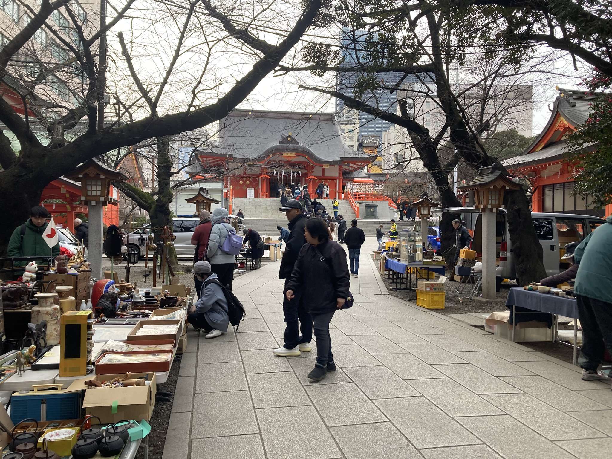 花園神社では行事のある日を除き毎週日曜日早朝から日没まで骨董市が開かれています。