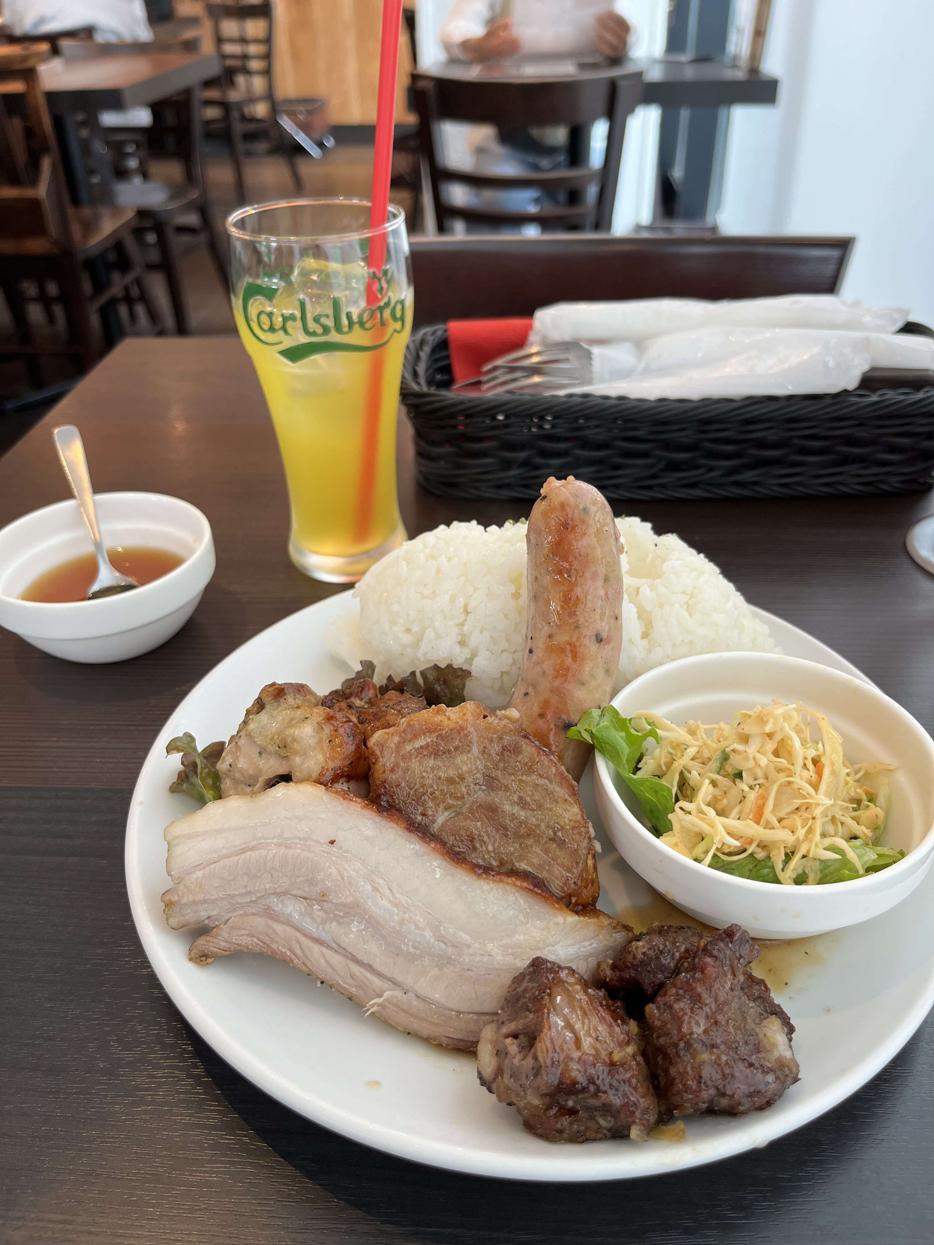 「シュラスコ専用のオーブンでじっくりと焼き上げたビーフ・ポーク・チキンが1度に楽しめる贅沢プレート。(メニューより)」写真のライスは大盛りです。左の小鉢は肉用のタレ。お皿の小鉢はコールスローです。