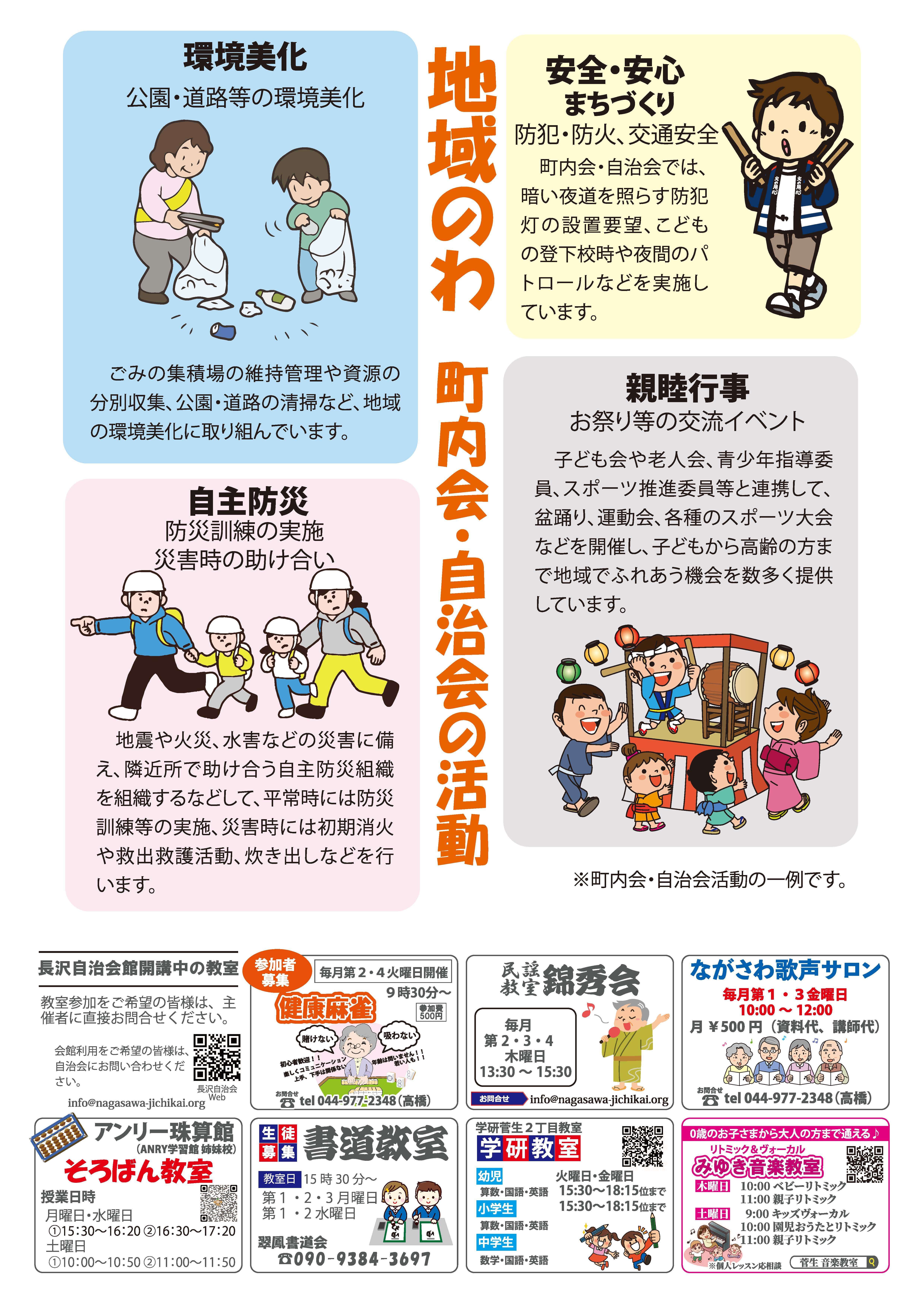 (宮前区)長沢自治会では、自治会館を利用した教室や団体が集まった『会館まつり』を3月23日(日)に長沢自治会館(宮前区菅生2-17-1)で開催する。