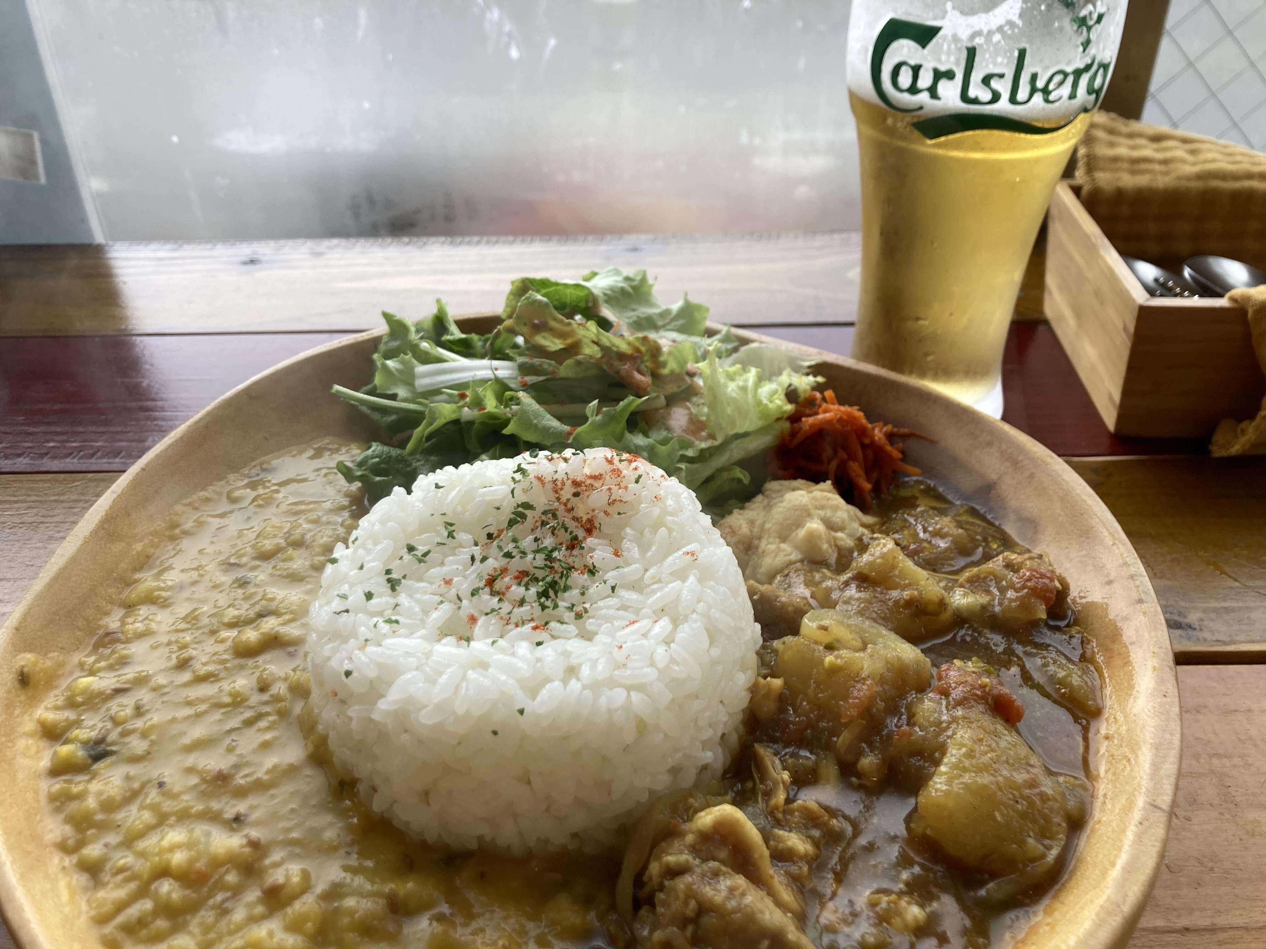 メニューーを眺め、ランチメニューの中から、2種あいがけのカレー(4種の中から選べます)と、ビールを注文しました。ランチのドリンクでビールが選べるって、嬉しいですね。