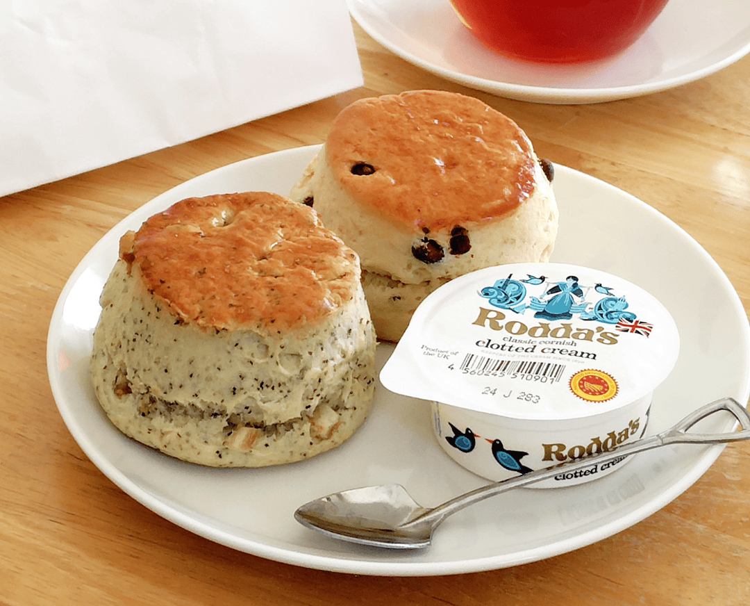 テイクアウトした、本格的な「コーニッシュ・スコーン」。クロテッドクリーム、バター、卵をたっぷり使用した風味豊かなスコーンです。