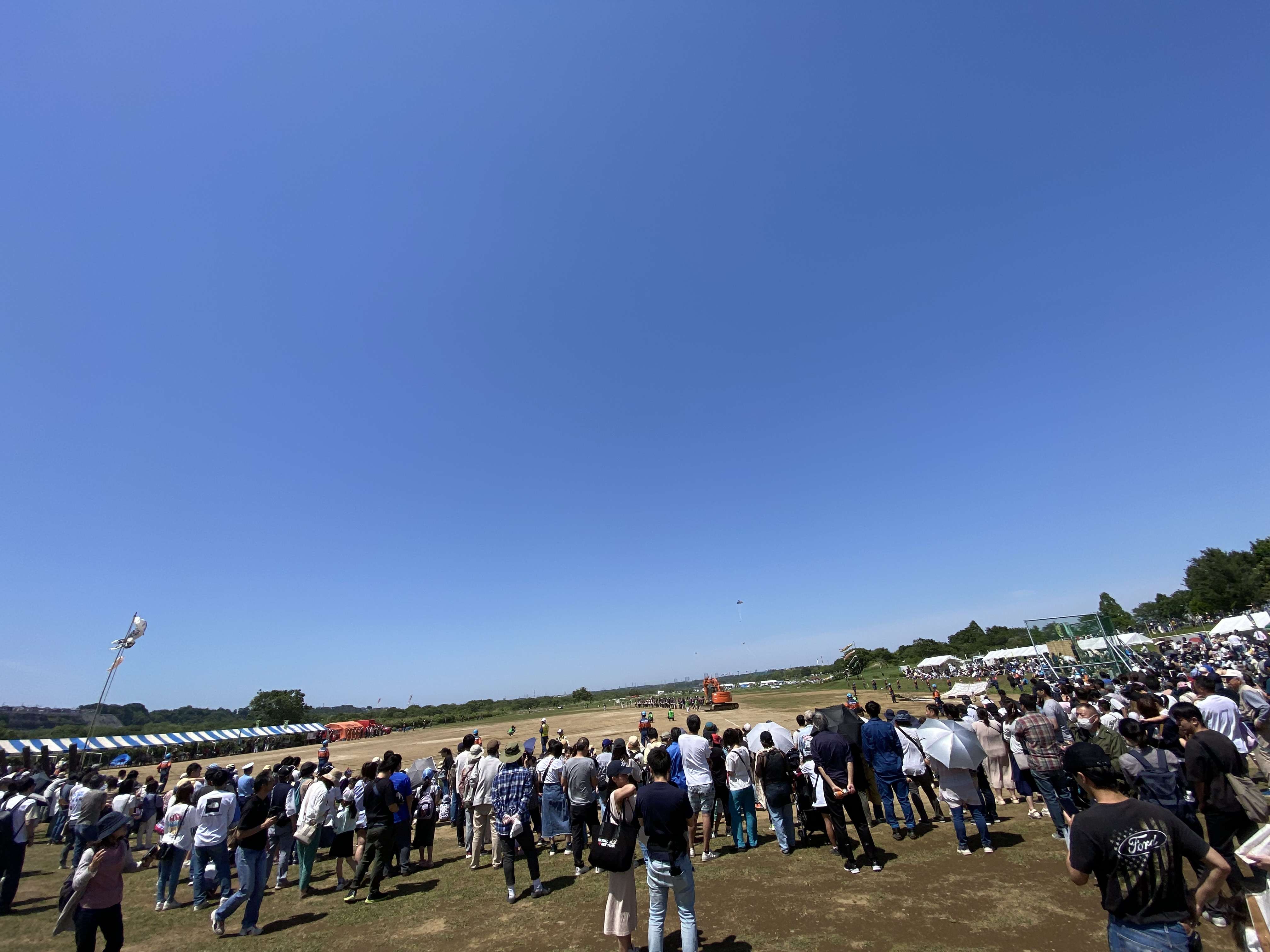 長さ180m以上ある広場に大人100名以上の方が引き手になり風などの様子を伺いながら観客はいまかいまかと待ち望み視線のさきには大空と重さ1トン縦横13mある大凧の迫力