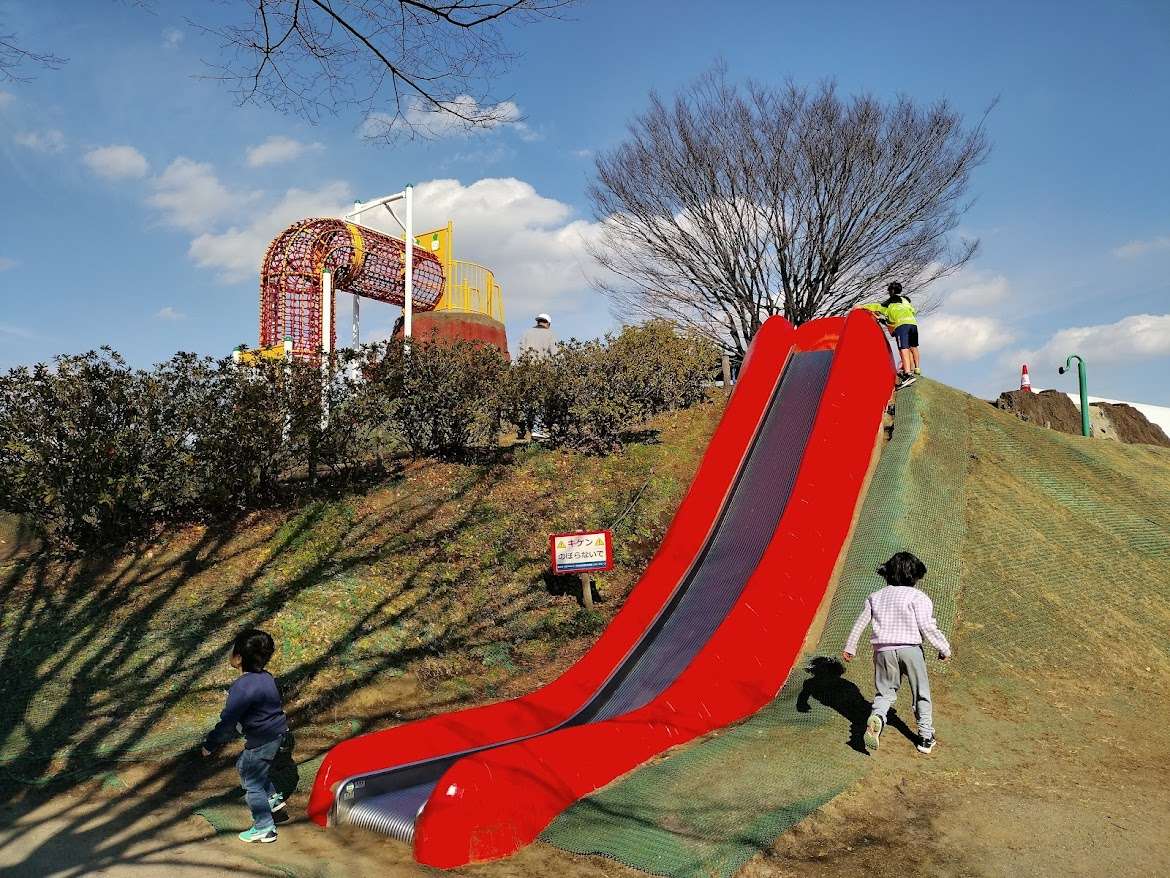 公園内にあるわんぱく広場には、大きなすべり台やブランコなどの遊具があります。