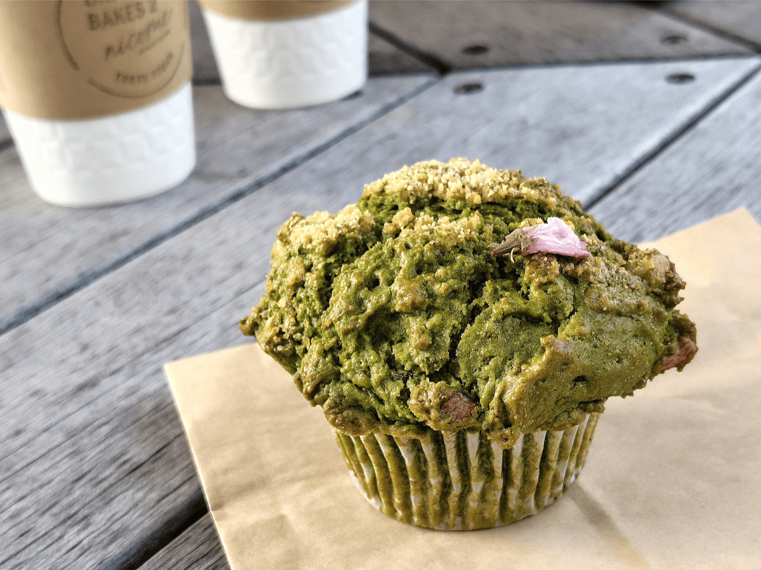 テイクアウトしたマフィン(抹茶)。チョコ、ベリー、かぼちゃなど、フレーバーは日替わりで楽しめます。