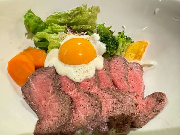 ローストビーフには玉子もトッピングされていて、見た目にも華やかでご馳走感たっぷり。今回は〈肉シングル 60g〉をいただきましたが、柔らかい肉質で、期待通りの美味しさでした。