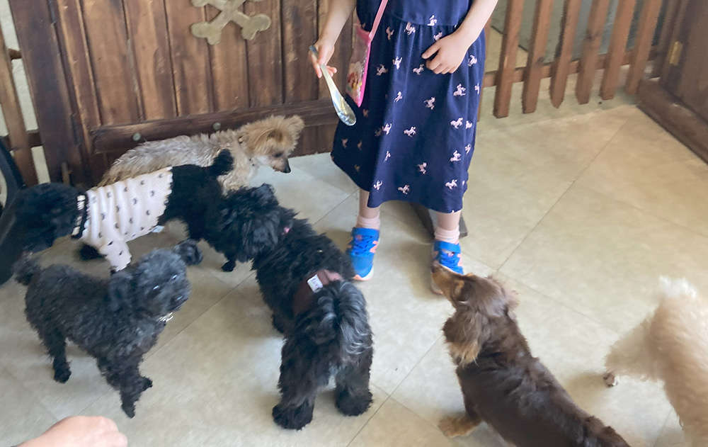 犬のおやつを持ってエリアに入るとたくさん集まってきて、「ちょうだい、ちょうだい!」と囲まれました。