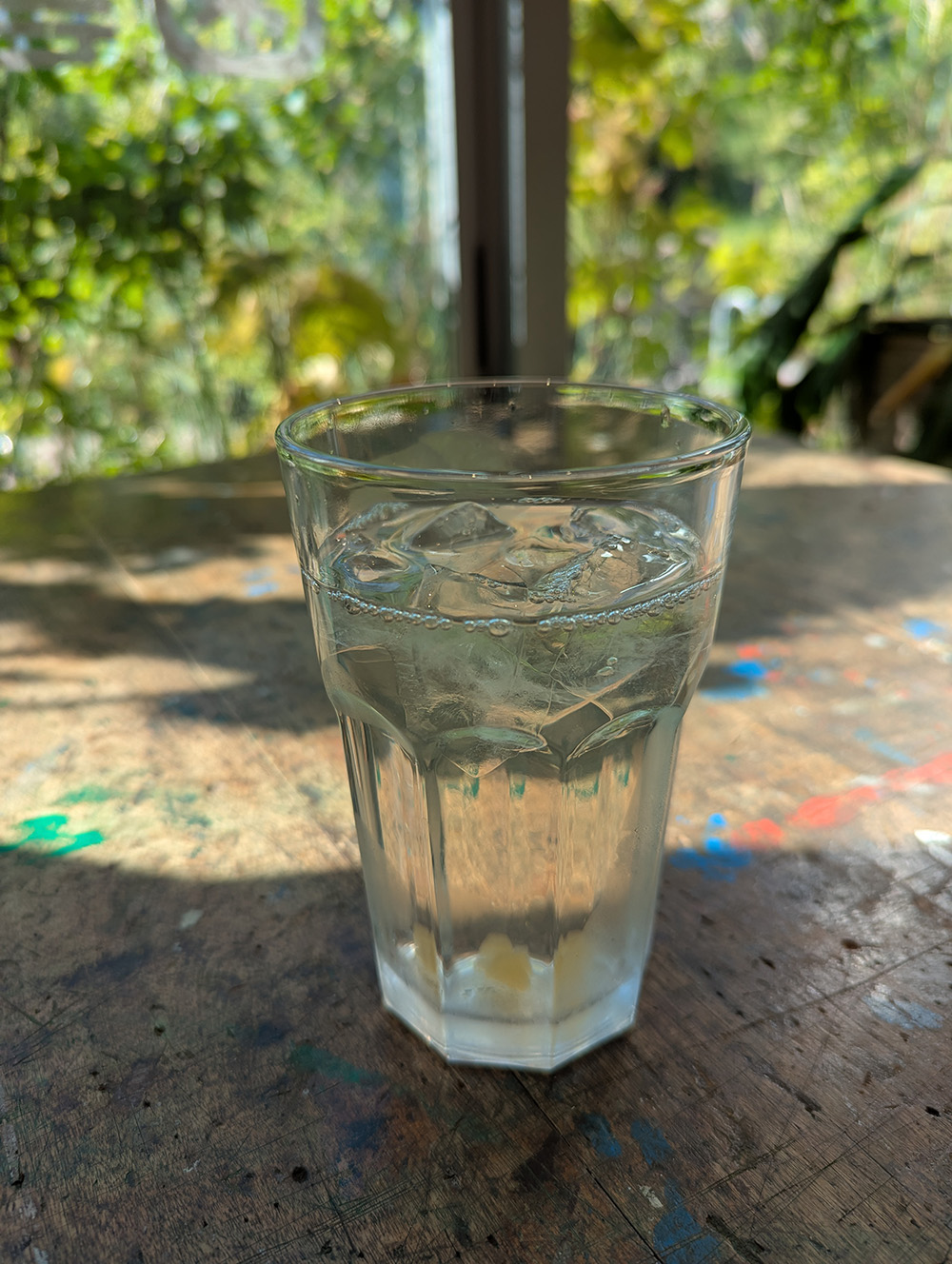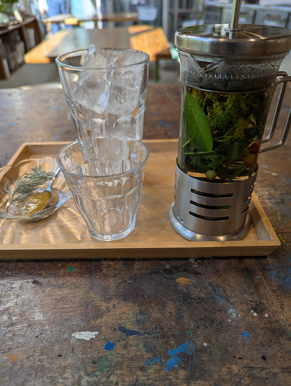 摘み取り中ハーブの効能や特徴の説明もあり、あっと言う間の摘み取り体験をしたあとはハーブをお茶として頂きます。ハーブティーは、ホットが主流ですが、夏ということもあり氷入グラスも添えてくださいました。