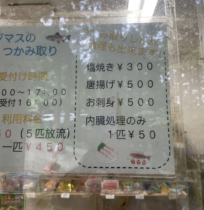 掴み取りしたマスは、自分で焼いてもよいですし、山小屋にあるレストランでお刺身や唐揚げにもしてくれ、とても美味かったです。