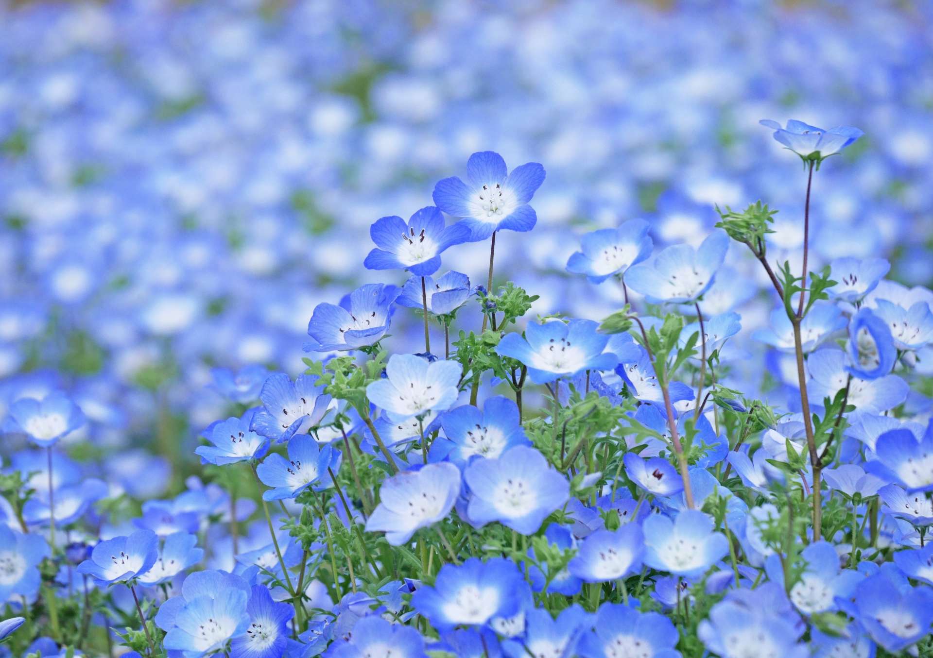 淡い青色のネモフィラが一面に広がる様子は美しく幻想的。