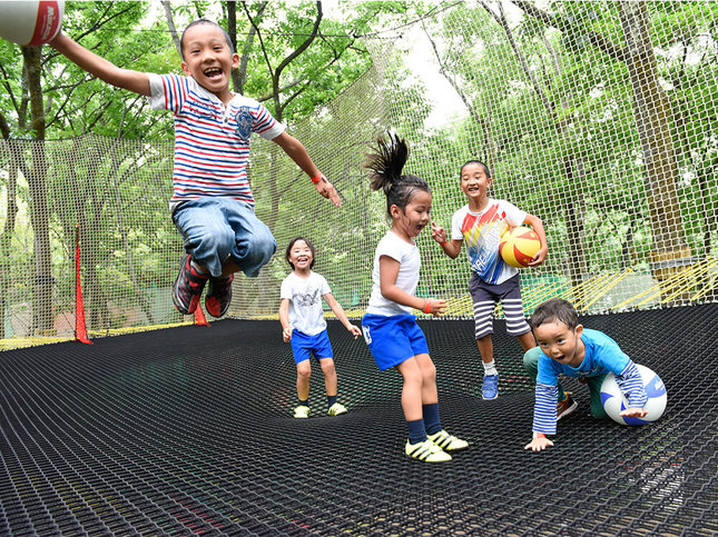 森の中に張り巡らされたいろんな形・種類の網を、くぐったり、跳ねたり、滑ったり。
