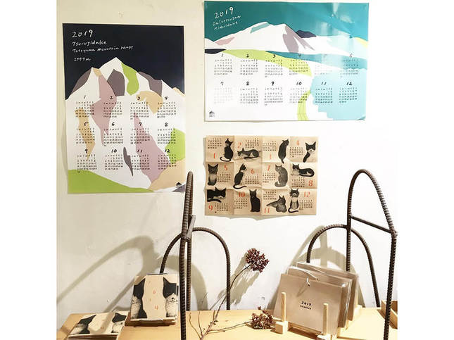 版画作家坂本千明さんの猫のイラストが可愛い「楳カレンダー」や、「cafe + gallery 芝生」内で二人展を行った保手濱拓さんのカラフルなドローイングが目を引くカレンダーなど、アーティスティックなカレンダーが並びます。