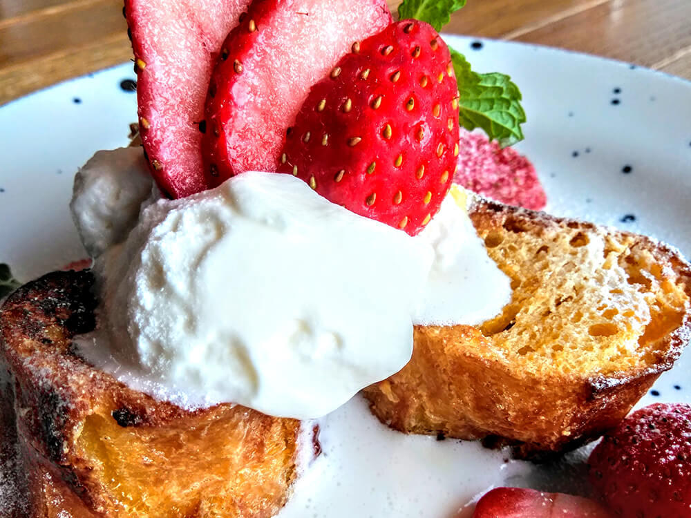 デザートにフレンチトースト頼んだら、イチゴと生クリームたっぷりで、旨すぎる!