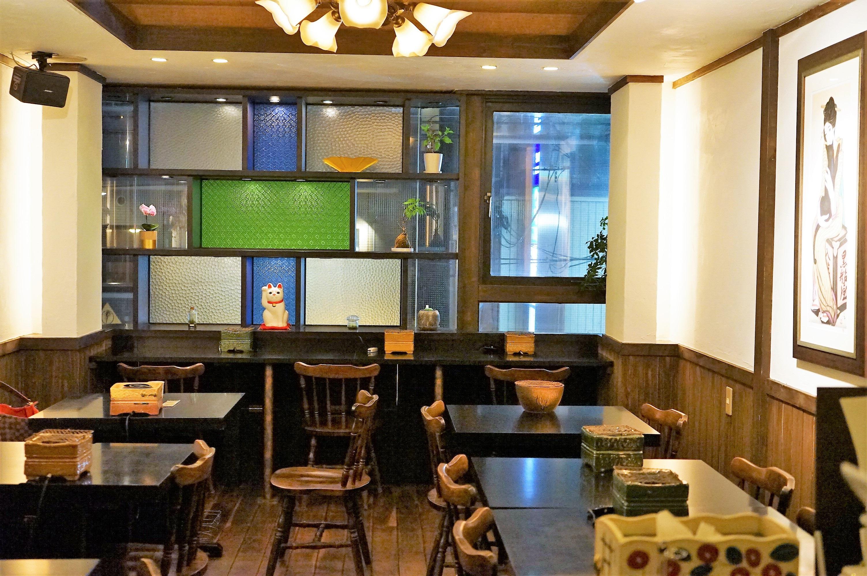 店内には色ガラスや招き猫など大正ロマンを感じるレトロな雰囲気も満点。